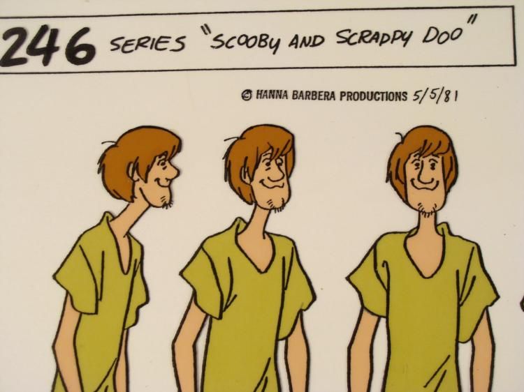 Shaggy from every angle * * * Original Animation Cel * * Medium: Hand painted acetate celDetails: Animation notations and peg holesHanna Barbera Productions 5/5/81From 246 series "Scooby and Scrappy Doo" * * Size of cel: 10 1/2 x 12 1/2 inchesCondition: Excellent * * * This is an original hand-painted cel set-up used in the production of the "Scooby Doo." Each one-of-a-kind set-up represents a slight change in position of the characters. When individually photographed and projected in rapid succession, the images appear to * move. To created production cels, the original animator's drawing is transferred onto an acetate cel (by hand-inking and/or photo copying). The cel is then hand-painted on the reverse side. The cel is in a protective sleeve. * * *