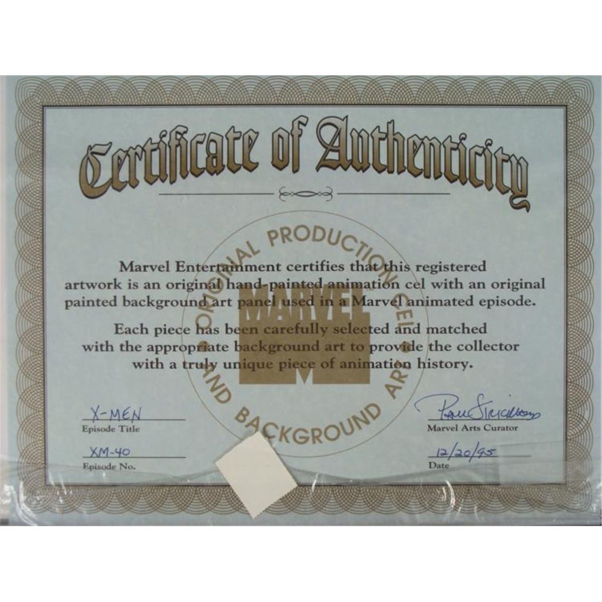 This is an original signed production cel and background from the hit series X-Men. Stan Lee signature is located on the bottom right of cel in black sharpie. * Under a cloud of increasing anti-mutant sentiment, Professor Xavier creates a haven at his Westchester mansion to train young mutants to use their powers for the benefit of humanity, and to prove mutants can be heroes. Xavier recruited Cyclops, Iceman, Angel, Beast and Jean Grey calling them "X-Men" because they possessed the "x-gene", an ability normal humans lacked. Early issues introduced the team's arch enemy, Magneto and his Brotherhood of Evil Mutants, who would later battle the X-Men for years. * Damn, this is hot!!! * * Original Animated Cel Overall Size of the Cel: 10 1/2" x 12 1/2" Overall Size of the background: 10 1/4" x 14 1/4" Excellent Condition This is an original hand-painted cel set-up used in the production of an episode of X-Men titled "Dazzled." Each one-of-a-kind set-up represents a slight change in position of the characters. When individually photographed and projected in rapid succession, the images appear to move. * To create production cels, the original animator's drawing is transferred onto an acetate cel (by hand-inking and/or photo copying). The cel is then hand-painted on the reverse side. The background accompanying this set-up is an original production background. * The cel and original background is ready to be matted and framed. The animators notations are located at the top of the cel and background. A certificate of Authenticity from Marvel is on the back of background. The Marvel Seal is located at the bottom left of the cel. The cel and background are in a protective sleeve An information card about the episode is located at the top right of the protective sleeve. *