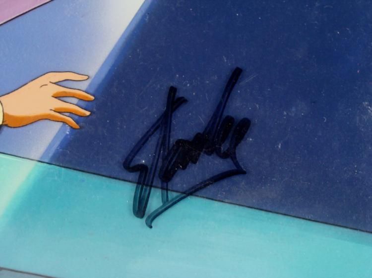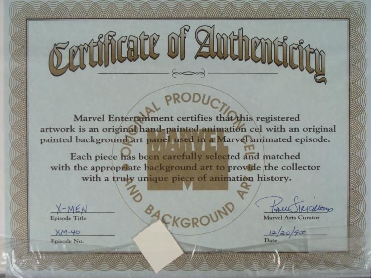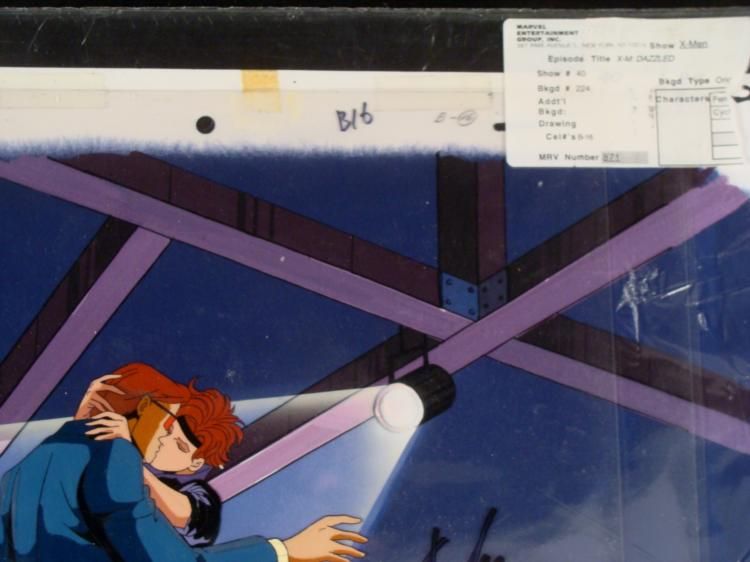 This is an original signed production cel and background from the hit series X-Men. Stan Lee signature is located on the bottom right of cel in black sharpie. * Under a cloud of increasing anti-mutant sentiment, Professor Xavier creates a haven at his Westchester mansion to train young mutants to use their powers for the benefit of humanity, and to prove mutants can be heroes. Xavier recruited Cyclops, Iceman, Angel, Beast and Jean Grey calling them "X-Men" because they possessed the "x-gene", an ability normal humans lacked. Early issues introduced the team's arch enemy, Magneto and his Brotherhood of Evil Mutants, who would later battle the X-Men for years. * Damn, this is hot!!! * * Original Animated Cel Overall Size of the Cel: 10 1/2" x 12 1/2" Overall Size of the background: 10 1/4" x 14 1/4" Excellent Condition This is an original hand-painted cel set-up used in the production of an episode of X-Men titled "Dazzled." Each one-of-a-kind set-up represents a slight change in position of the characters. When individually photographed and projected in rapid succession, the images appear to move. * To create production cels, the original animator's drawing is transferred onto an acetate cel (by hand-inking and/or photo copying). The cel is then hand-painted on the reverse side. The background accompanying this set-up is an original production background. * The cel and original background is ready to be matted and framed. The animators notations are located at the top of the cel and background. A certificate of Authenticity from Marvel is on the back of background. The Marvel Seal is located at the bottom left of the cel. The cel and background are in a protective sleeve An information card about the episode is located at the top right of the protective sleeve. *
