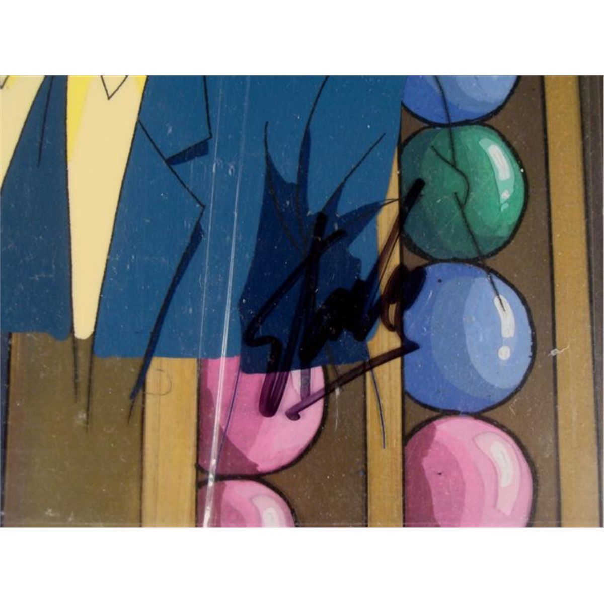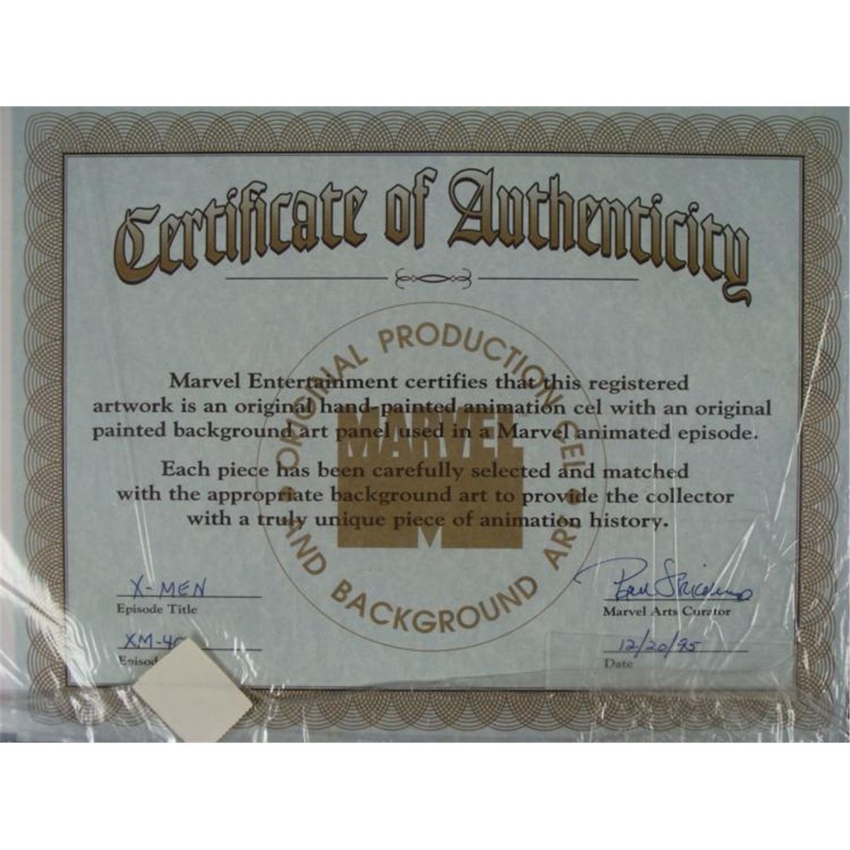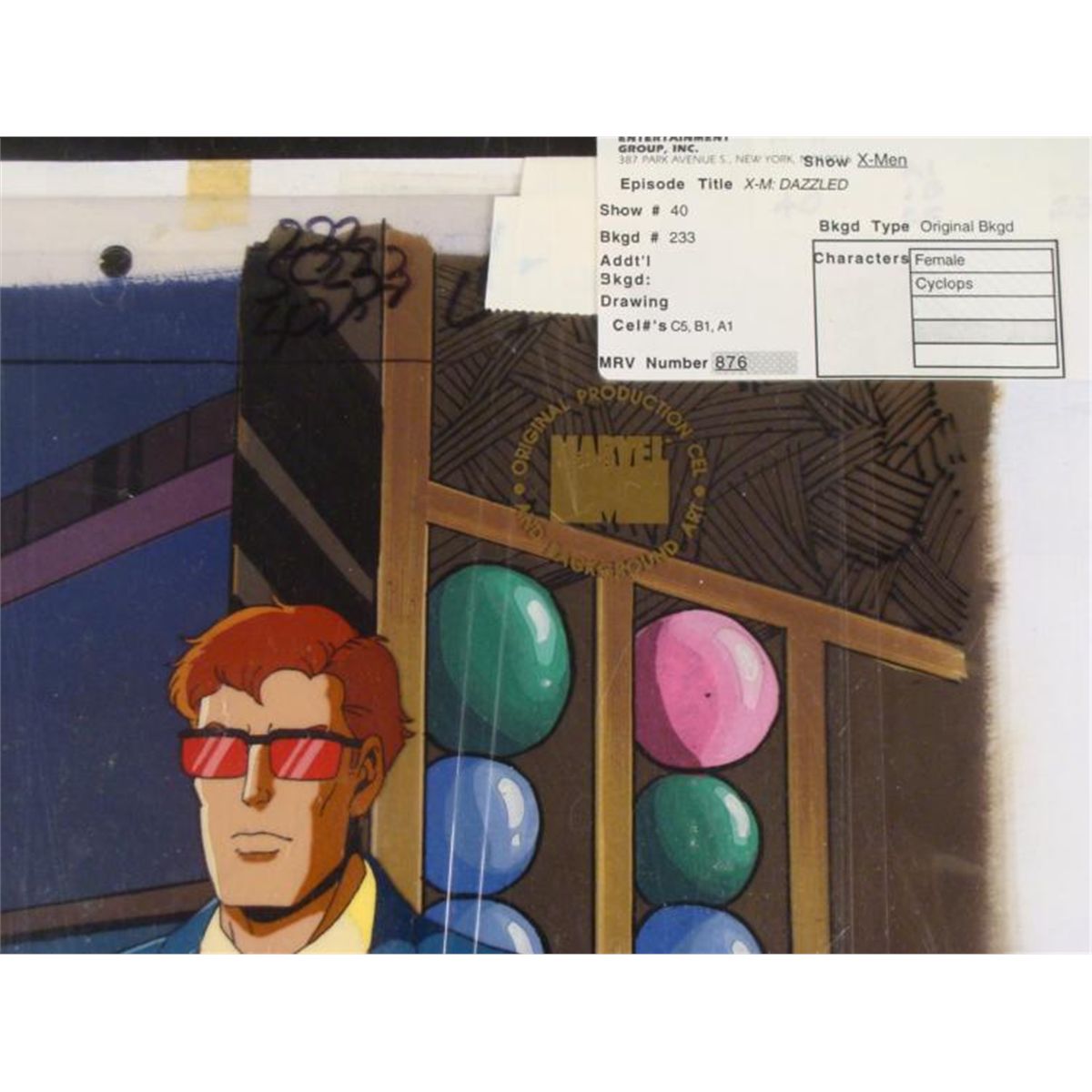 This is an original signed production cel and background from the hit series X-Men. Stan Lee signature is located on the bottom right of cel in black sharpie. * Note: This is a double layer cel; the mouth appears out of position here, but the cel can be moved. The mouth is done separately because this was a speaking scene with an animated mouth and stationery characters.Under a cloud of increasing anti-mutant sentiment, Professor Xavier creates a haven at his Westchester mansion to train young mutants to use their powers for the benefit of humanity, and to prove mutants can be heroes. Xavier recruited Cyclops, Iceman, Angel, Beast and Jean Grey calling them "X-Men" because they possessed the "x-gene", an ability normal humans lacked. Early issues introduced the team's arch enemy, Magneto and his Brotherhood of Evil Mutants, who would later battle the X-Men for years. * Check it out, we are totally incognito right now... * * Original Animated Cel Overall Size of the Cel: 10 1/2" x 12 1/2" Overall Size of the background: 10 1/4" x 14 1/4" Excellent Condition This is an original hand-painted cel set-up used in the production of an episode of X-Men titled "Dazzled." Each one-of-a-kind set-up represents a slight change in position of the characters. When individually photographed and projected in rapid succession, the images appear to move. * To create production cels, the original animator's drawing is transferred onto an acetate cel (by hand-inking and/or photo copying). The cel is then hand-painted on the reverse side. The background accompanying this set-up is an original production background. * The cel and original background is ready to be matted and framed. The animators notations are located at the top of the cel and background. A certificate of Authenticity from Marvel is on the back of background. The Marvel Seal is located at the top right of the cel. The cel and background are in a protective sleeve An information card about the episode is located at the top right of the protective sleeve. *