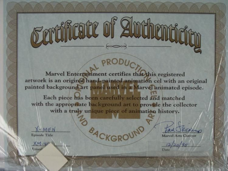 This is an original signed production cel and background from the hit series X-Men. Stan Lee signature is located on the bottom right of cel in black sharpie. * Note: This is a double layer cel; the mouth appears out of position here, but the cel can be moved. The mouth is done separately because this was a speaking scene with an animated mouth and stationery characters.Under a cloud of increasing anti-mutant sentiment, Professor Xavier creates a haven at his Westchester mansion to train young mutants to use their powers for the benefit of humanity, and to prove mutants can be heroes. Xavier recruited Cyclops, Iceman, Angel, Beast and Jean Grey calling them "X-Men" because they possessed the "x-gene", an ability normal humans lacked. Early issues introduced the team's arch enemy, Magneto and his Brotherhood of Evil Mutants, who would later battle the X-Men for years. * Check it out, we are totally incognito right now... * * Original Animated Cel Overall Size of the Cel: 10 1/2" x 12 1/2" Overall Size of the background: 10 1/4" x 14 1/4" Excellent Condition This is an original hand-painted cel set-up used in the production of an episode of X-Men titled "Dazzled." Each one-of-a-kind set-up represents a slight change in position of the characters. When individually photographed and projected in rapid succession, the images appear to move. * To create production cels, the original animator's drawing is transferred onto an acetate cel (by hand-inking and/or photo copying). The cel is then hand-painted on the reverse side. The background accompanying this set-up is an original production background. * The cel and original background is ready to be matted and framed. The animators notations are located at the top of the cel and background. A certificate of Authenticity from Marvel is on the back of background. The Marvel Seal is located at the top right of the cel. The cel and background are in a protective sleeve An information card about the episode is located at the top right of the protective sleeve. *