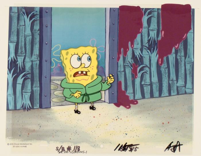 This animation cel and reproduction background are from the Nickelodeon TV show SpongeBob Squarepants. The story takes place under the deep blue sea in Bikini Bottom, where SpongeBob resides. SpongeBob, who is a yellow, porous sponge, is your typical happy-go-lucky character, as he is always cheerful and enjoys making people laugh. Patrick Star, SpongeBob's neighbor who is a starfish, is your average children's show idiot, as he boasts knowing nothing and is often getting himself into ridiculous situations. Between the homes of these two lies the home of the miserable Squidward, a squid, who is known for being grouchy and playing tricks on SpongeBob and Patrick. Both SpongeBob and Squidward work at the Krusty Krab, a fast food business run by the greedy money-loving Mr. Krabs, a crab, the arch rival of the evil, possibly misunderstood, Plankton. Another neighbor, Sandy Cheeks, an athletic squirrel who normally wears an astronaut's space suit, was introduced in "Tea at the Treedome." She spends most of her time inventing and experimenting. Why is there slime on the wall?Original Printed Background and Animated Cel Overall Size of Background: 11" x 17" Overall Size of the Cel: 10 1/2" x 12 1/2" Very good condition This is an original hand-painted cel set-up used in the production of an episode of "SpongeBob SquarePants." Each one-of-a-kind set-up represents a slight change in position of the characters. When individually photographed and projected in rapid succession, the images appear to move.
