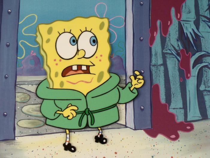 This animation cel and reproduction background are from the Nickelodeon TV show SpongeBob Squarepants. The story takes place under the deep blue sea in Bikini Bottom, where SpongeBob resides. SpongeBob, who is a yellow, porous sponge, is your typical happy-go-lucky character, as he is always cheerful and enjoys making people laugh. Patrick Star, SpongeBob's neighbor who is a starfish, is your average children's show idiot, as he boasts knowing nothing and is often getting himself into ridiculous situations. Between the homes of these two lies the home of the miserable Squidward, a squid, who is known for being grouchy and playing tricks on SpongeBob and Patrick. Both SpongeBob and Squidward work at the Krusty Krab, a fast food business run by the greedy money-loving Mr. Krabs, a crab, the arch rival of the evil, possibly misunderstood, Plankton. Another neighbor, Sandy Cheeks, an athletic squirrel who normally wears an astronaut's space suit, was introduced in "Tea at the Treedome." She spends most of her time inventing and experimenting. Why is there slime on the wall?Original Printed Background and Animated Cel Overall Size of Background: 11" x 17" Overall Size of the Cel: 10 1/2" x 12 1/2" Very good condition This is an original hand-painted cel set-up used in the production of an episode of "SpongeBob SquarePants." Each one-of-a-kind set-up represents a slight change in position of the characters. When individually photographed and projected in rapid succession, the images appear to move.