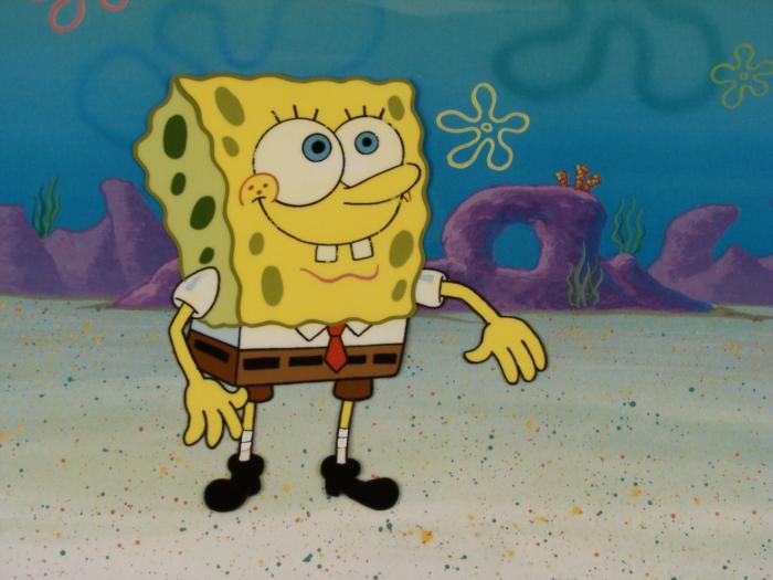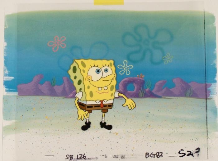 This animation cel and reproduction background are from the Nickelodeon TV show SpongeBob Squarepants. The story takes place under the deep blue sea in Bikini Bottom, where SpongeBob resides. SpongeBob, who is a yellow, porous sponge, is your typical happy-go-lucky character, as he is always cheerful and enjoys making people laugh. Patrick Star, SpongeBob's neighbor who is a starfish, is your average children's show idiot, as he boasts knowing nothing and is often getting himself into ridiculous situations. Between the homes of these two lies the home of the miserable Squidward, a squid, who is known for being grouchy and playing tricks on SpongeBob and Patrick. Both SpongeBob and Squidward work at the Krusty Krab, a fast food business run by the greedy money-loving Mr. Krabs, a crab, the arch rival of the evil, possibly misunderstood, Plankton. Another neighbor, Sandy Cheeks, an athletic squirrel who normally wears an astronaut's space suit, was introduced in "Tea at the Treedome." She spends most of her time inventing and experimenting. SpongeBob looks very jolly.Original Printed Background and Animated Cel Overall Size of Background: 10 1/2" x 17" Overall Size of the Cel: 10 1/2" x 12 1/2" Very good condition This is an original hand-painted cel set-up used in the production of an episode of "SpongeBob SquarePants." Each one-of-a-kind set-up represents a slight change in position of the characters. When individually photographed and projected in rapid succession, the images appear to move.