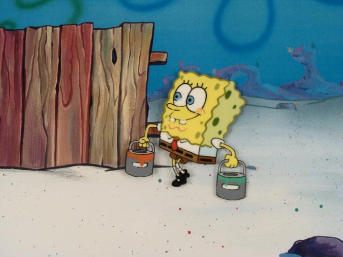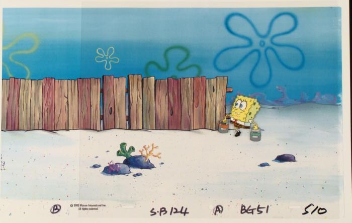 This animation cel and reproduction background are from the Nickelodeon TV show SpongeBob Squarepants. The story takes place under the deep blue sea in Bikini Bottom, where SpongeBob resides. SpongeBob, who is a yellow, porous sponge, is your typical happy-go-lucky character, as he is always cheerful and enjoys making people laugh. Patrick Star, SpongeBob's neighbor who is a starfish, is your average children's show idiot, as he boasts knowing nothing and is often getting himself into ridiculous situations. Between the homes of these two lies the home of the miserable Squidward, a squid, who is known for being grouchy and playing tricks on SpongeBob and Patrick. Both SpongeBob and Squidward work at the Krusty Krab, a fast food business run by the greedy money-loving Mr. Krabs, a crab, the arch rival of the evil, possibly misunderstood, Plankton. Another neighbor, Sandy Cheeks, an athletic squirrel who normally wears an astronaut's space suit, was introduced in "Tea at the Treedome." She spends most of her time inventing and experimenting. Why does SpongeBob have green and red paint?Original Printed Background and Animated Cel Overall Size of Background: 11" x 17" Overall Size of the Cel: 10 1/2" x 12 1/2" Very good condition This is an original hand-painted cel set-up used in the production of an episode of "SpongeBob SquarePants." Each one-of-a-kind set-up represents a slight change in position of the characters. When individually photographed and projected in rapid succession, the images appear to move.