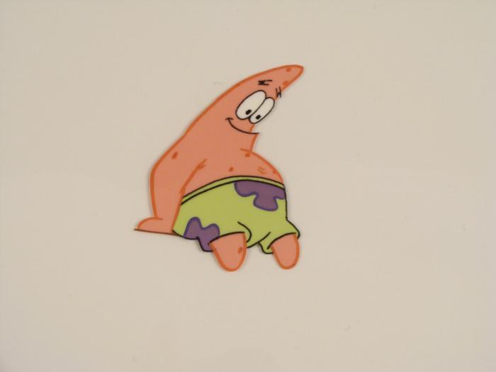 This original animation cel is from the Nickelodeon TV show SpongeBob Squarepants. The story takes place under the deep blue sea in Bikini Bottom, where SpongeBob resides. SpongeBob, who is a yellow, porous sponge, is your typical happy-go-lucky character, as he is always cheerful and enjoys making people laugh. Patrick Star, SpongeBob's neighbor who is a starfish, is your average children's show idiot, as he boasts knowing nothing and is often getting himself into ridiculous situations. Between the homes of these two lies the home of the miserable Squidward, a squid, who is known for being grouchy and playing tricks on SpongeBob and Patrick. Both SpongeBob and Squidward work at the Krusty Krab, a fast food business run by the greedy money-loving Mr. Krabs, a crab, the arch rival of the evil, possibly misunderstood, Plankton. Another neighbor, Sandy Cheeks, an athletic squirrel who normally wears an astronaut's space suit, was introduced in "Tea at the Treedome." She spends most of her time inventing and experimenting. Patrick is sitting down.Original Production Animated Cel Overall Size of Cel: 10 1/2" x 12 1/2" Very Good ConditionThis is an original hand-painted cel set-up used in the production of an episode of "SpongeBob SquarePants." Each one-of-a-kind set-up represents a slight change in position of the characters. When individually photographed and projected in rapid succession, the images appear to move.