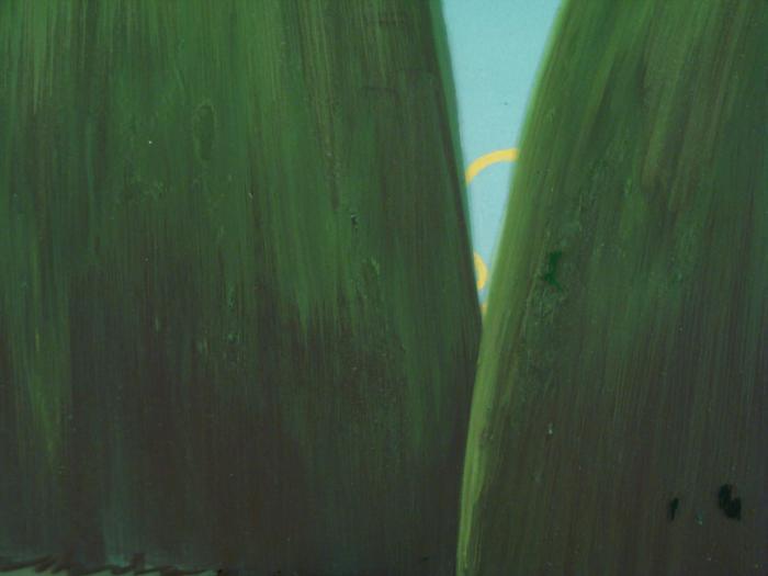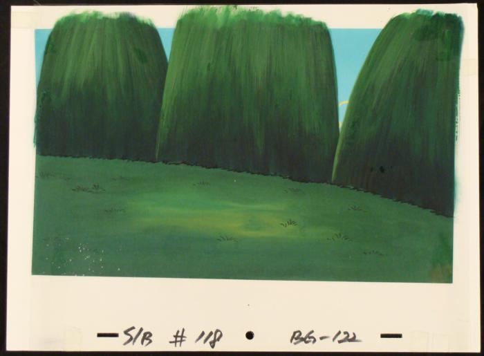 To create production cels, the original animator's drawing is transferred onto an acetate cel (by hand-inking and/or photo copying). The cel is then hand-painted on the reverse side. The background accompanying this set-up is a hand-painted original production background. The background is ready to be matted and framed. It is a colored background with a cel and has the animator's notations at the bottom of the background and the cel. The cel has a protective over-layer cel with nothing on it.
