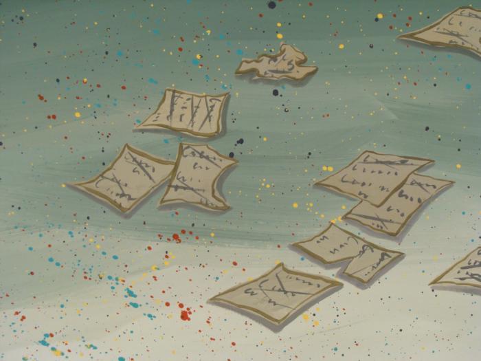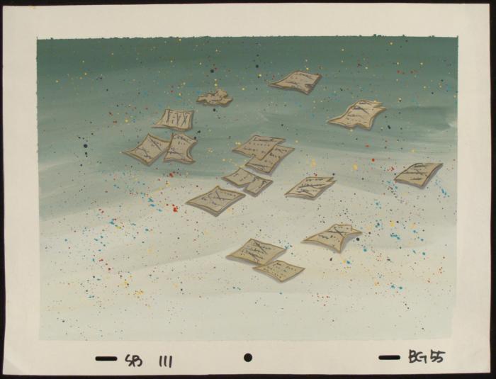 This original hand-painted background from the Nickelodeon TV show SpongeBob Squarepants. The story takes place under the deep blue sea in Bikini Bottom, where SpongeBob resides. SpongeBob, who is a yellow, porous sponge, is your typical happy-go-lucky character, as he is always cheerful and enjoys making people laugh. Patrick Star, SpongeBob's neighbor who is a starfish, is your average children's show idiot, as he boasts knowing nothing and is often getting himself into ridiculous situations. Between the homes of these two lies the home of the miserable Squidward, a squid, who is known for being grouchy and playing tricks on SpongeBob and Patrick. Both SpongeBob and Squidward work at the Krusty Krab, a fast food business run by the greedy money-loving Mr. Krabs, a crab, the arch rival of the evil, possibly misunderstood, Plankton. Another neighbor, Sandy Cheeks, an athletic squirrel who normally wears an astronaut's space suit, was introduced in "Tea at the Treedome." She spends most of her time inventing and experimenting. Why are there papers on the ground?Original Production Background Overall Size of Background: 10 1/2" x 13 3/4" Very good condition; it has been stored Original Production Backgrounds are used in the making of the final version of animated productions. The background establishes the location and the overall good mood of the scenee. Typically, a background layout artist creates a drawing to establish the content of the scene, placement of characters, perspective and camera angle. Based on this drawing, the background artist creates a preliminary painting to confirm all of the scenes details, then the final production background which is used in the filming of the scene. When these backgrounds are individually photographed behind the progression of production cels, and projected at a rapid succession, the images in the foreground appear to move, creating an animated scene. The background is ready to be matted and framed. It is a colored background with the animator's notations at the bottom.