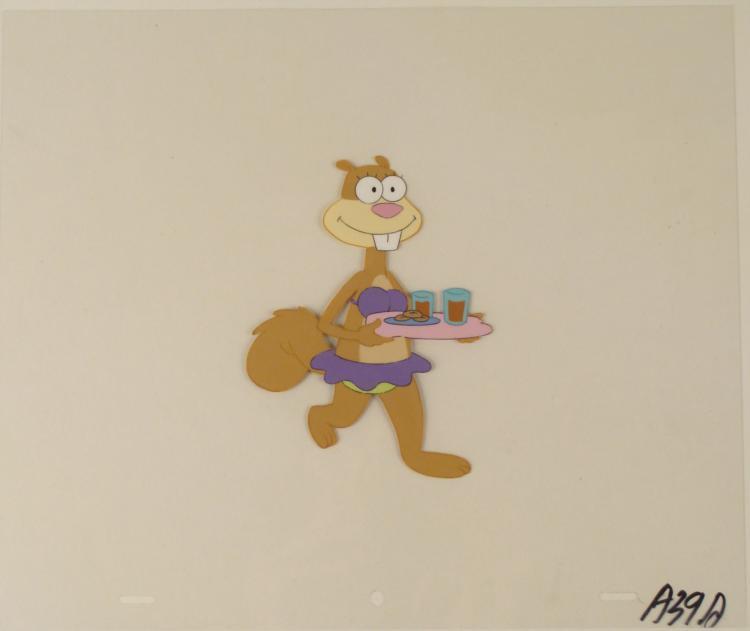 This original animation cel is from the Nickelodeon TV show SpongeBob Squarepants. The story takes place under the deep blue sea in Bikini Bottom, where SpongeBob resides. SpongeBob, who is a yellow, porous sponge, is your typical happy-go-lucky character, as he is always cheerful and enjoys making people laugh. Patrick Star, SpongeBob's neighbor who is a starfish, is your average children's show idiot, as he boasts knowing nothing and is often getting himself into ridiculous situations. Between the homes of these two lies the home of the miserable Squidward, a squid, who is known for being grouchy and playing tricks on SpongeBob and Patrick. Both SpongeBob and Squidward work at the Krusty Krab, a fast food business run by the greedy money-loving Mr. Krabs, a crab, the arch rival of the evil, possibly misunderstood, Plankton. Another neighbor, Sandy Cheeks, an athletic squirrel who normally wears an astronaut's space suit, was introduced in "Tea at the Treedome." She spends most of her time inventing and experimenting. * Snack is now serverd! * Original Production Animated Cel Overall Size of Cel: 10 1/2" x 12 1/2" Very Good Condition This is an original hand-painted cel set-up used in the production of an episode of "SpongeBob SquarePants." Each one-of-a-kind set-up represents a slight change in position of the characters. When individually photographed and projected in rapid succession, the images appear to move. * To create production cels, the original animator's drawing is transferred onto an acetate cel (by hand-inking and/or photo copying). The cel is then hand-painted on the reverse side. * The cel received by the winning bidder may be ever so slightly different from the one in the auction photos. * The cel is ready to be matted and framed. The animator's notations are at the bottom of the cel. There is some slight paint fade to Sandy's outline. *