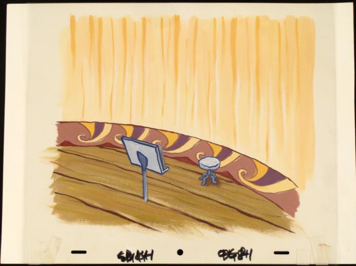 To create production cels, the original animator's drawing is transferred onto an acetate cel (by hand-inking and/or photo copying). The cel is then hand-painted on the reverse side. The background accompanying this set-up is a hand-painted original production background. The background is ready to be matted and framed. It is a colored background with a cel and has the animator's notations at the bottom of the background and the cel. There is a extra cel to protect the cel with the music stand on it.