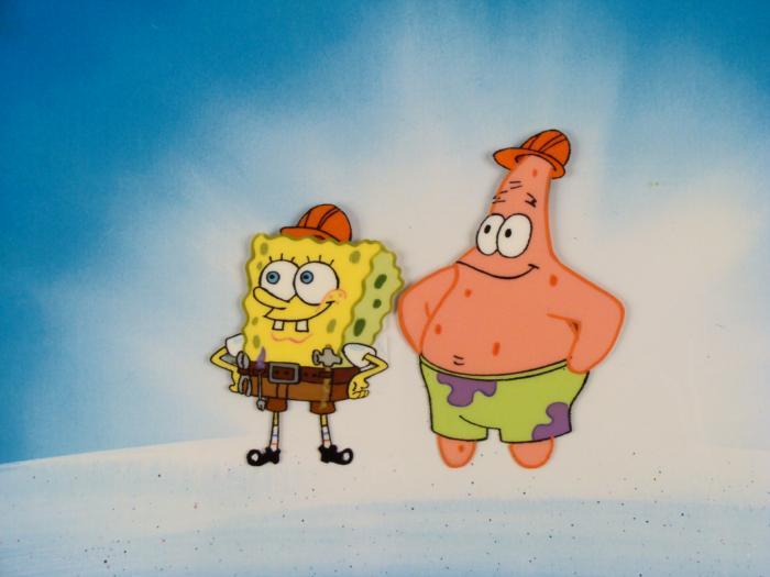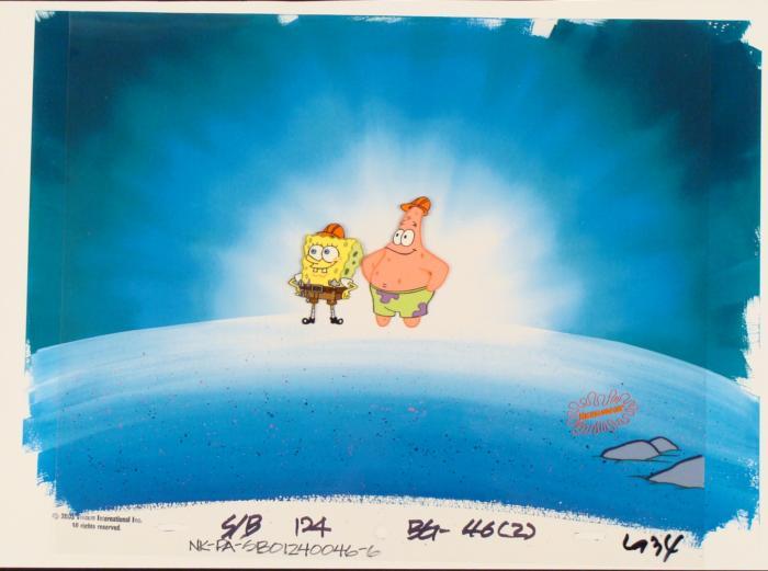 This original animation cel and reproduction background are from the Nickelodeon TV show SpongeBob Squarepants. The story takes place under the deep blue sea in Bikini Bottom, where SpongeBob resides. SpongeBob, who is a yellow, porous sponge, is your typical happy-go-lucky character, as he is always cheerful and enjoys making people laugh. Patrick Star, SpongeBob's neighbor who is a starfish, is your average children's show idiot, as he boasts knowing nothing and is often getting himself into ridiculous situations. Between the homes of these two lies the home of the miserable Squidward, a squid, who is known for being grouchy and playing tricks on SpongeBob and Patrick. Both SpongeBob and Squidward work at the Krusty Krab, a fast food business run by the greedy money-loving Mr. Krabs, a crab, the arch rival of the evil, possibly misunderstood, Plankton. Another neighbor, Sandy Cheeks, an athletic squirrel who normally wears an astronaut's space suit, was introduced in "Tea at the Treedome." She spends most of her time inventing and experimenting. Spongebob and Patrick feel like they are ontop of the world, nothing could stop them now...Original Animated Cel and Reproduction Background Overall Size of Background: 11" x 17" Overall Size of the Cel: 10 1/2" x 12 1/2" Excellent conditionThis is an original hand-painted cel set-up used in the production of an episode of "SpongeBob SquarePants." Each one-of-a-kind set-up represents a slight change in position of the characters. When individually photographed and projected in rapid succession, the images appear to move.