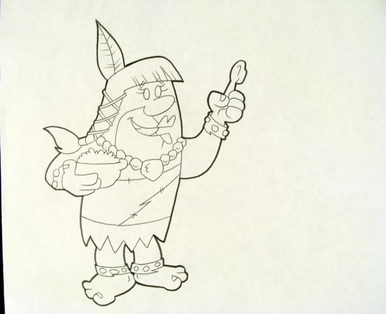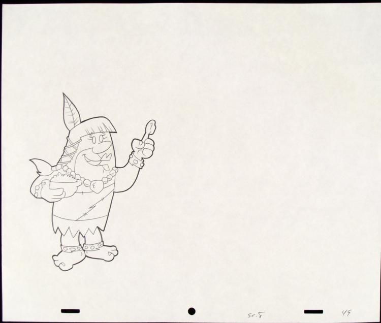 The show is set in the Stone Age town of Bedrock. (In some of the earlier episodes, it was also referred to as "Rockville"). The Flintstones was about a working-class Stone Age man's life with his family and his next-door neighbor and best friend. The show's * continuing popularity rested heavily on its juxtaposition of modern everyday concerns in the Stone Age setting. In this fantasy version of the past, dinosaurs, saber-toothed tigers, woolly mammoths, and other long-extinct animals co-exist with cavemen. Like * their mid-20th century peers, these cavemen listen to records, live in split-level homes, and eat out at restaurants, yet their technology is made entirely from pre-industrial materials and largely powered through the use of various animals. For example, the * cars are made out of stone, wood, and animal skins, and powered by the passengers' feet. * * * Alright everyone, gather up, I want to tell you story... * * * * * Original "rough" animation drawing, in black pencil with the notations in black * * Overall size is a 12-field drawing that is 10 1/2" × 12 1/2" * Excellent condition * Traditional animation is a multi-step process which includes various types of art techniques. Drawings are a key part of the process, in which the animator creates the design and movement of the characters. Drawings are then transferred onto acetate cels * (by hand-inking and/or photo copying) to create a production cel, which is then hand painted on the back side, using paint colors chosen and approved by the creator of the series. * * * The drawing is ready to be matted and framed. The animator's notations are shown at the bottom of the drawing.