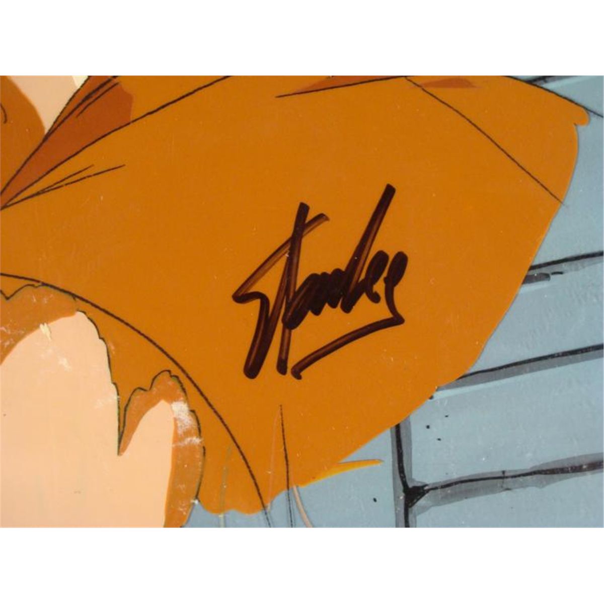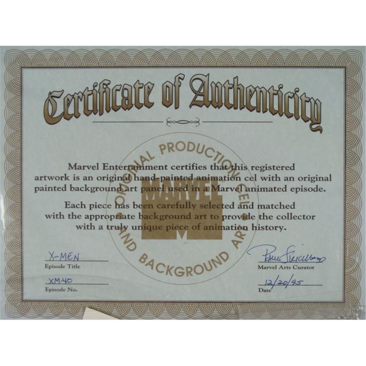 This is an original signed production cel and background from the hit series X-Men. Stan Lee signature is located on the right side of cel in black sharpie. * Under a cloud of increasing anti-mutant sentiment, Professor Xavier creates a haven at his Westchester mansion to train young mutants to use their powers for the benefit of humanity, and to prove mutants can be heroes. Xavier recruited Cyclops, Iceman, Angel, Beast and Jean Grey calling them "X-Men" because they possessed the "x-gene", an ability normal humans lacked. Early issues introduced the team's arch enemy, Magneto and his Brotherhood of Evil Mutants, who would later battle the X-Men for years. * You can't hold me forever!!! Do you have any idea who I am?!?!? * Original Animated Cel Overall Size of the Cel: 10 1/2" x 12 1/2" Overall Size of the background: 10 1/4" x 14 1/4" Very Good Condition This is an original hand-painted cel set-up used in the production of an episode of X-Men titled "Dazzled." Each one-of-a-kind set-up represents a slight change in position of the characters. When individually photographed and projected in rapid succession, the images appear to move. * To create production cels, the original animator's drawing is transferred onto an acetate cel (by hand-inking and/or photo copying). The cel is then hand-painted on the reverse side. The background accompanying this set-up is an original production background. * The cel and original background is ready to be matted and framed. The animators notations are located at the top of the cel and background. A certificate of Authenticity from Marvel is on the back of background. The Marvel Seal is located at the bottom left of the cel. The cel and background are in a protective sleeve An information card about the episode is located at the top right of the protective sleeve. There is some paper residue on the cel. * *