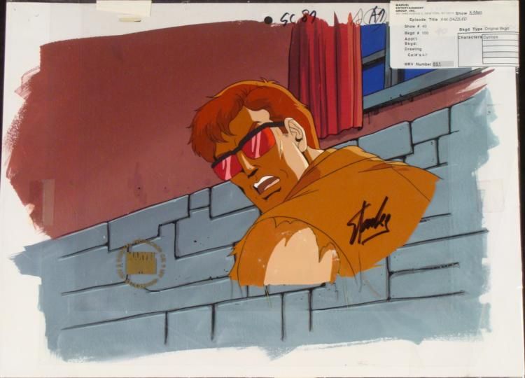 This is an original signed production cel and background from the hit series X-Men. Stan Lee signature is located on the right side of cel in black sharpie. * Under a cloud of increasing anti-mutant sentiment, Professor Xavier creates a haven at his Westchester mansion to train young mutants to use their powers for the benefit of humanity, and to prove mutants can be heroes. Xavier recruited Cyclops, Iceman, Angel, Beast and Jean Grey calling them "X-Men" because they possessed the "x-gene", an ability normal humans lacked. Early issues introduced the team's arch enemy, Magneto and his Brotherhood of Evil Mutants, who would later battle the X-Men for years. * You can't hold me forever!!! Do you have any idea who I am?!?!? * Original Animated Cel Overall Size of the Cel: 10 1/2" x 12 1/2" Overall Size of the background: 10 1/4" x 14 1/4" Very Good Condition This is an original hand-painted cel set-up used in the production of an episode of X-Men titled "Dazzled." Each one-of-a-kind set-up represents a slight change in position of the characters. When individually photographed and projected in rapid succession, the images appear to move. * To create production cels, the original animator's drawing is transferred onto an acetate cel (by hand-inking and/or photo copying). The cel is then hand-painted on the reverse side. The background accompanying this set-up is an original production background. * The cel and original background is ready to be matted and framed. The animators notations are located at the top of the cel and background. A certificate of Authenticity from Marvel is on the back of background. The Marvel Seal is located at the bottom left of the cel. The cel and background are in a protective sleeve An information card about the episode is located at the top right of the protective sleeve. There is some paper residue on the cel. * *