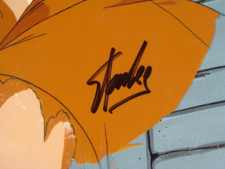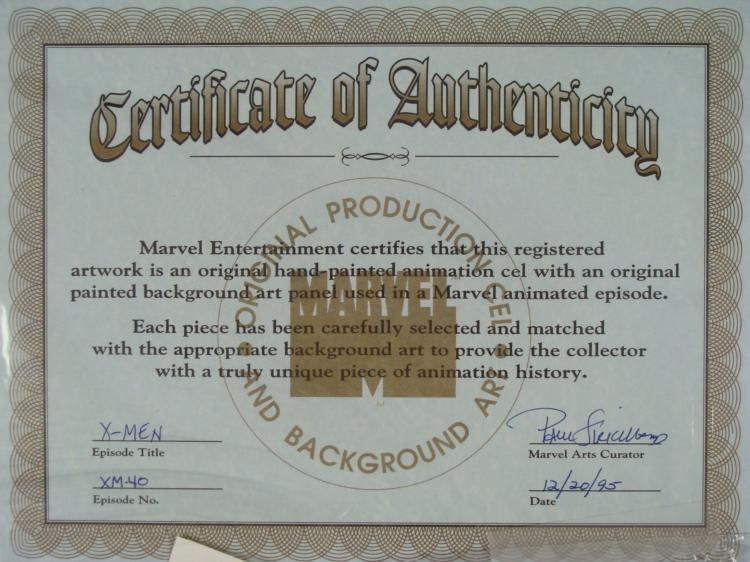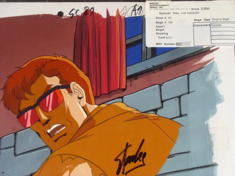 This is an original signed production cel and background from the hit series X-Men. Stan Lee signature is located on the right side of cel in black sharpie. * Under a cloud of increasing anti-mutant sentiment, Professor Xavier creates a haven at his Westchester mansion to train young mutants to use their powers for the benefit of humanity, and to prove mutants can be heroes. Xavier recruited Cyclops, Iceman, Angel, Beast and Jean Grey calling them "X-Men" because they possessed the "x-gene", an ability normal humans lacked. Early issues introduced the team's arch enemy, Magneto and his Brotherhood of Evil Mutants, who would later battle the X-Men for years. * You can't hold me forever!!! Do you have any idea who I am?!?!? * Original Animated Cel Overall Size of the Cel: 10 1/2" x 12 1/2" Overall Size of the background: 10 1/4" x 14 1/4" Very Good Condition This is an original hand-painted cel set-up used in the production of an episode of X-Men titled "Dazzled." Each one-of-a-kind set-up represents a slight change in position of the characters. When individually photographed and projected in rapid succession, the images appear to move. * To create production cels, the original animator's drawing is transferred onto an acetate cel (by hand-inking and/or photo copying). The cel is then hand-painted on the reverse side. The background accompanying this set-up is an original production background. * The cel and original background is ready to be matted and framed. The animators notations are located at the top of the cel and background. A certificate of Authenticity from Marvel is on the back of background. The Marvel Seal is located at the bottom left of the cel. The cel and background are in a protective sleeve An information card about the episode is located at the top right of the protective sleeve. There is some paper residue on the cel. * *