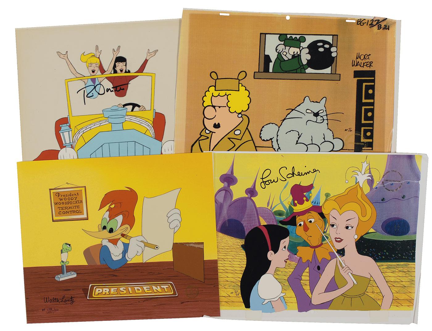 Four hand-painted color animation cels from Beetle Bailey, Archie (including original matching hand-drawn animation drawing), Woody Woodpecker, and The Wizard of Oz, each approximately 14 x 11, each set against its original painted background. Each cel is signed in black felt tip by either Walter Lantz, Mort Walker, Ron Dante, or Lou Scheimer—with all but Archie individually numbered in a limited edition series and carrying an adhesive sticker identifying it as such. In overall fine condition with a crease along the lower right corner of the Walker and Scheimer examples.