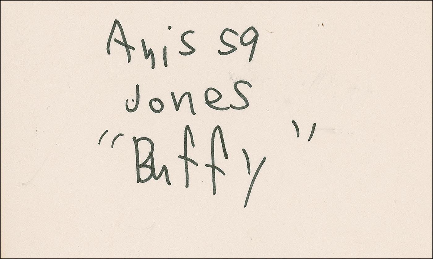 American juvenile actress (1958–1976) best known for her role as Buffy on the popular television series Family Affair. After the series ended, and with her career at a standstill—she auditioned unsuccessfully for the role in The Exorcist that went to Linda Blair—Jones was sent to juvenile hall as a runaway, failed to finish high school, and fell in with dubious company. She died in her sleep at the age of 18 from an overdose described by the coroner as the worst he had ever seen. Felt tip in-person signature, “Anissa Jones ‘Buffy,’” on a 5 x 3 card. In fine condition.