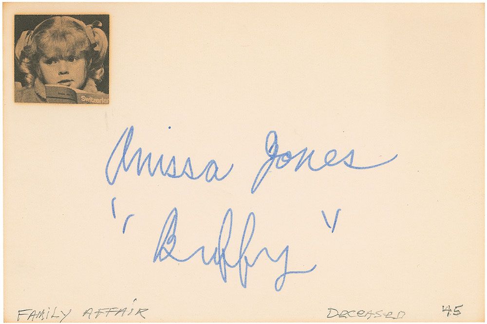 Vintage felt tip signature, “Anissa Jones, ‘Buffy,’” on an off-white 6 x 4 card, with a small clipped photo affixed to top left and collector’s notations along bottom. In fine condition, with some slight edge toning.