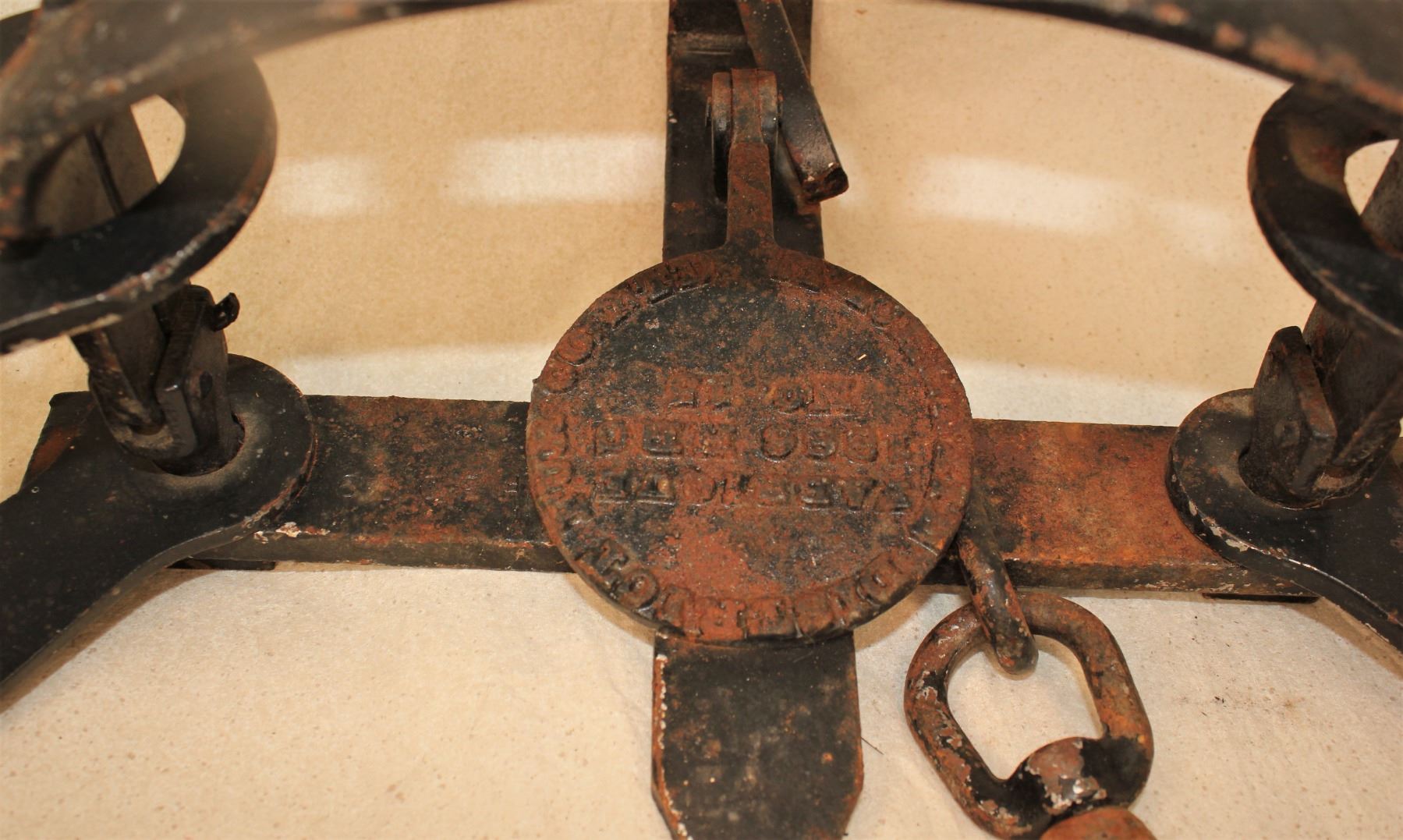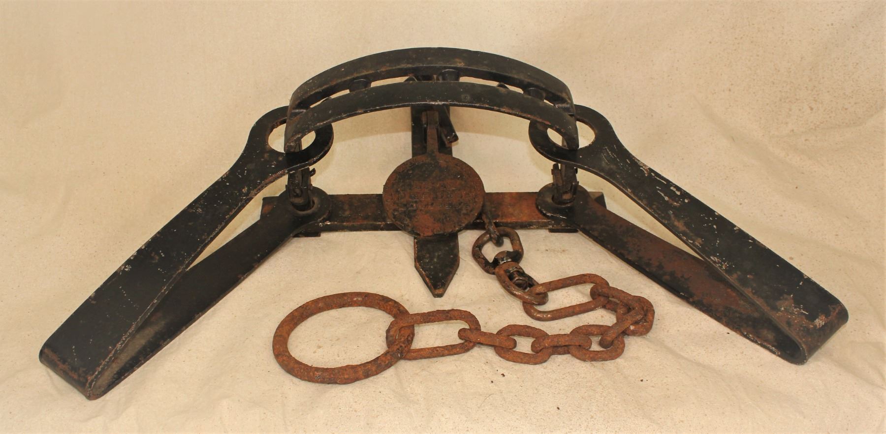 Highly collected large bear trap, marked on the pan "Mackenzie District Fur Co. LTD. #15 HBC 1888", with massive jaws, exposed teeth, and original chain. Measuring 35" in overall length.