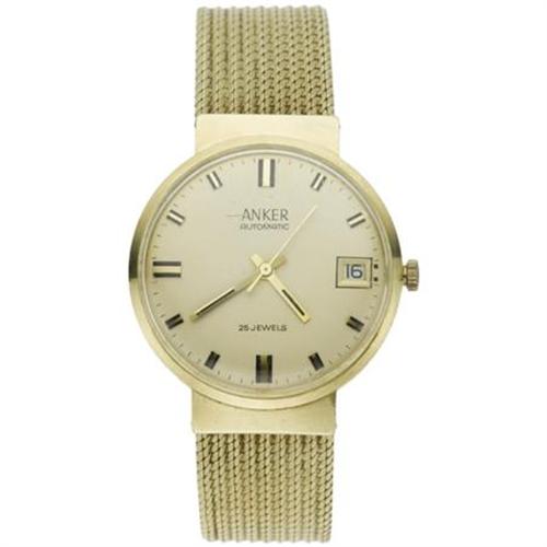 <B>Anker Men's Gold Automatic Bump Wind Date Integral Bracelet Wristwatch</B></I><BR><BR>Case: 40 x 35 mm, circular with extended lugs, 14k yellow gold with pressure sealed caseback<BR>Dial: goldtone with applied Hour Indexes, goldtone "Baton" hands and sweep seconds with sunken date aperture, plastic crystal<BR>Movement: 25 jewels automatic bump wind <BR>Bracelet: 14k yellow gold integral woven bracelet with foldover clasp; 8 inches<BR><BR> <B>Condition Report:</B> Normal signs of wear as appropriate with age. Watch is currently in working order. Gross weight: 59.00 grams. Circa 1970.<BR><BR><b>Shipping:</b> Miscellaneous Collectibles, Smal (<a target="_blank" href="http://www.heritageauctions.com/common/shipping.php">view shipping information</a>)