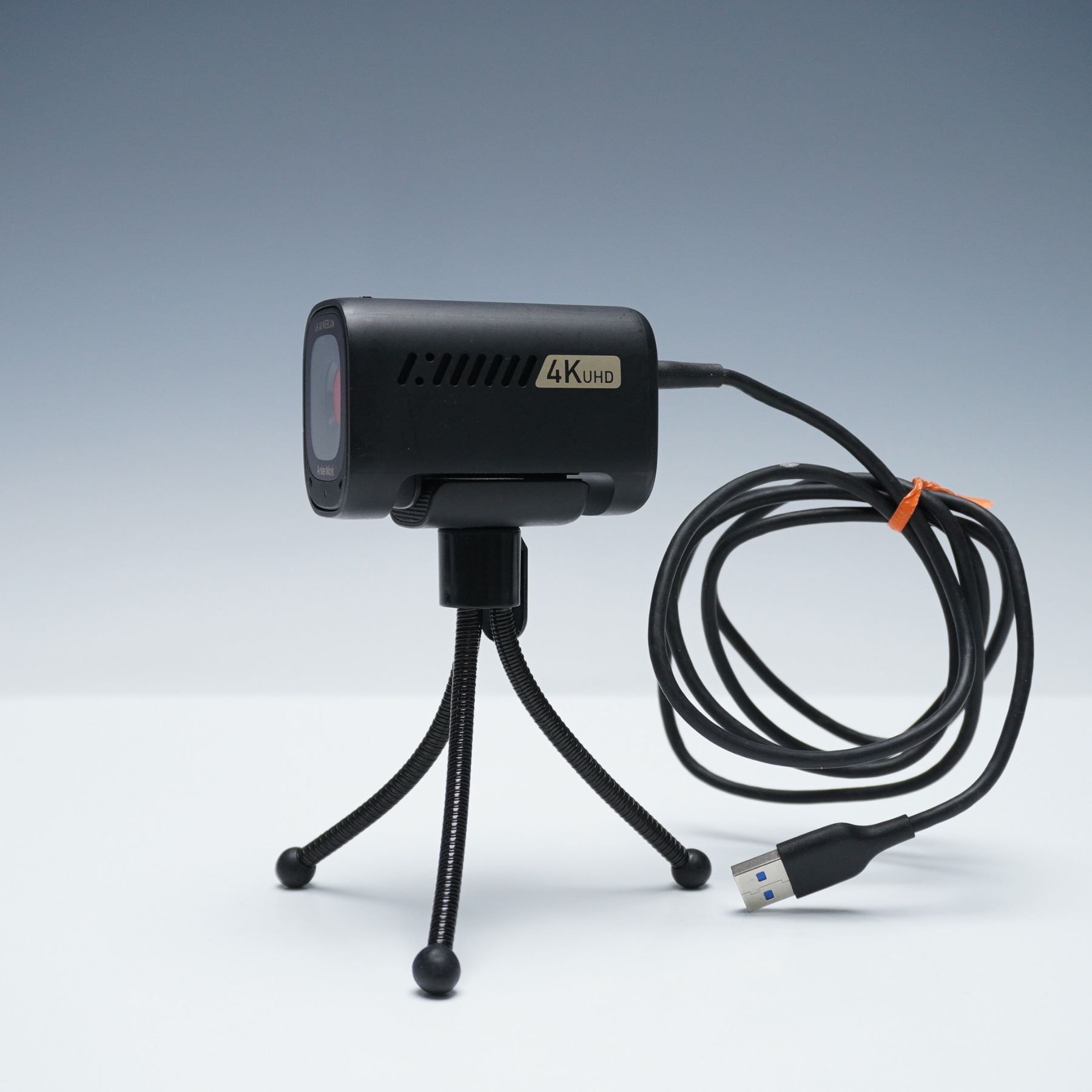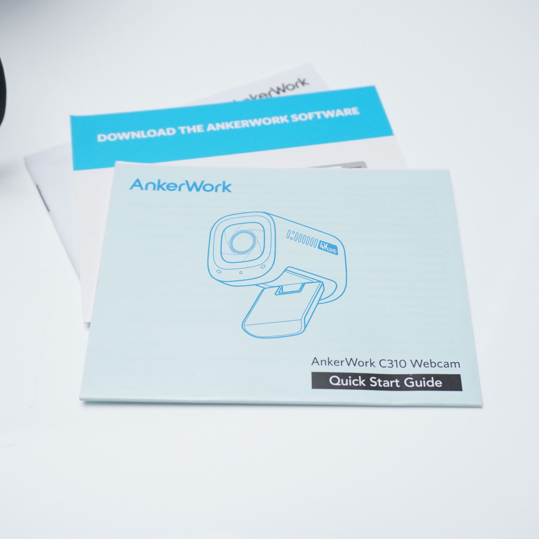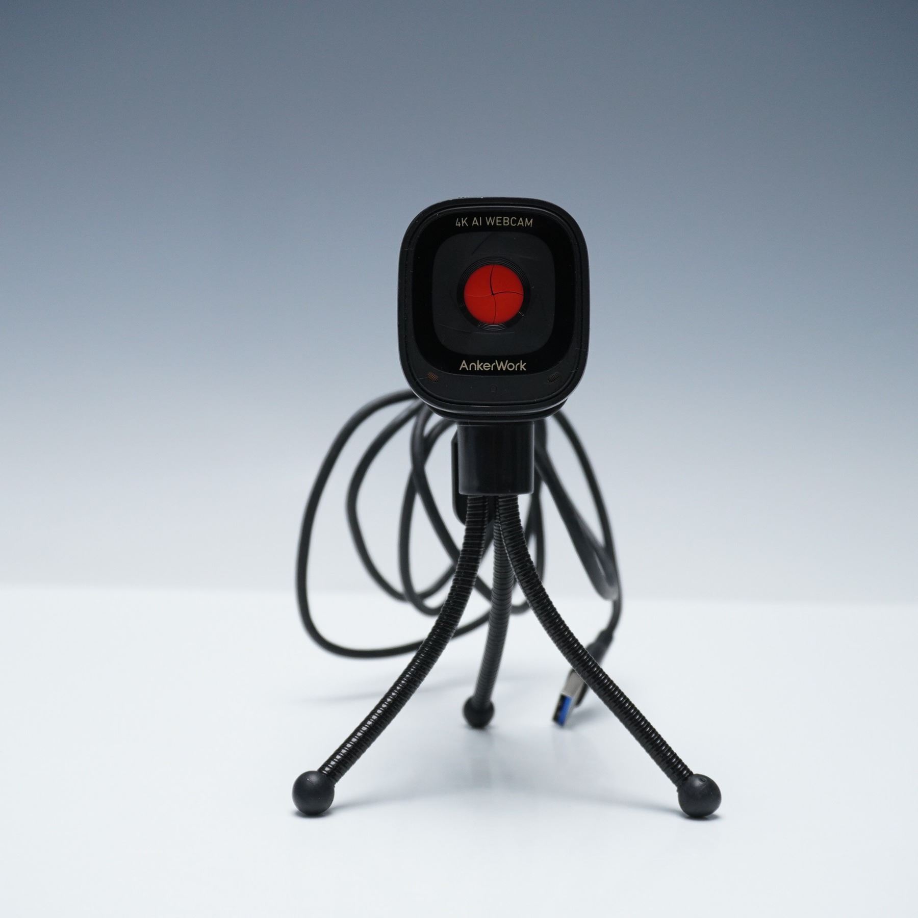 AnkerWork C310 4K AI-powered webcam featuring HDR, 12MP resolution, and dual microphones, designed for high-performance streaming and conferencing. This webcam supports 1080p at 60fps, offers smart auto-framing and AI autofocus, and includes a USB cable, quick start guide, and adjustable tripod. Measures approximately 3"L x 2"H.