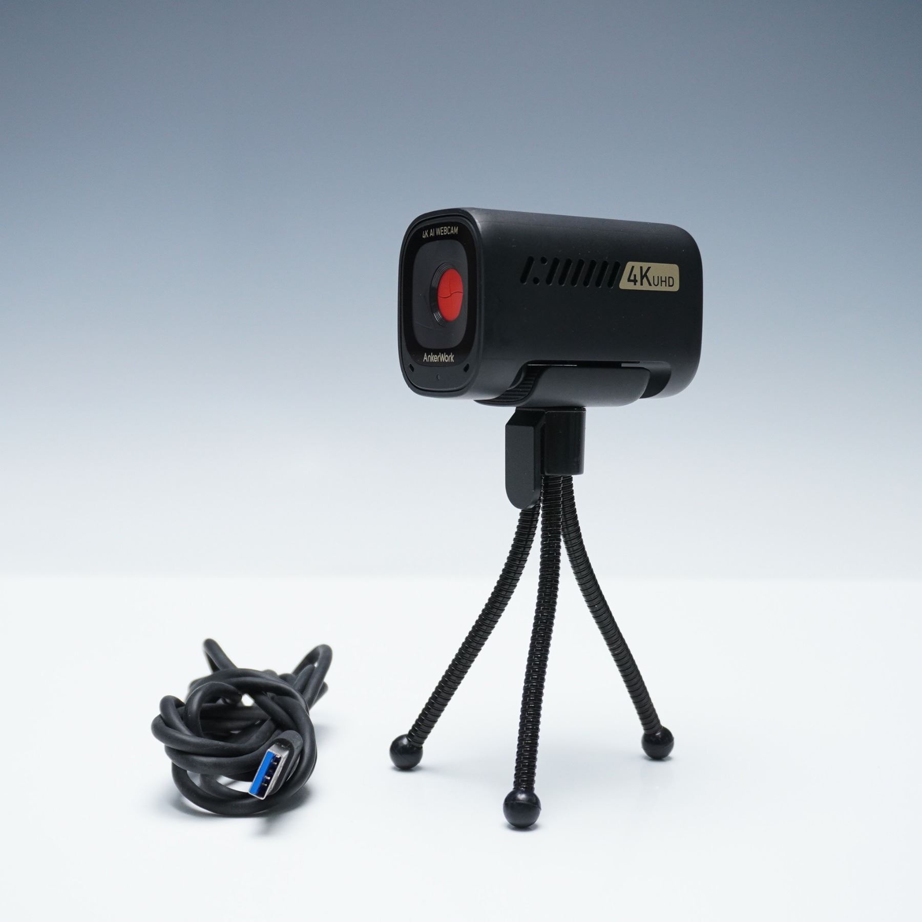AnkerWork C310 4K AI Webcam with original box, tripod stand, and USB 3.0 connection cable. This high-resolution webcam delivers crisp 4K UHD video with AI-powered features including automatic framing and HDR support, ideal for professional streaming or virtual meetings. Compact and adjustable design with flexible tripod legs for versatile mounting.