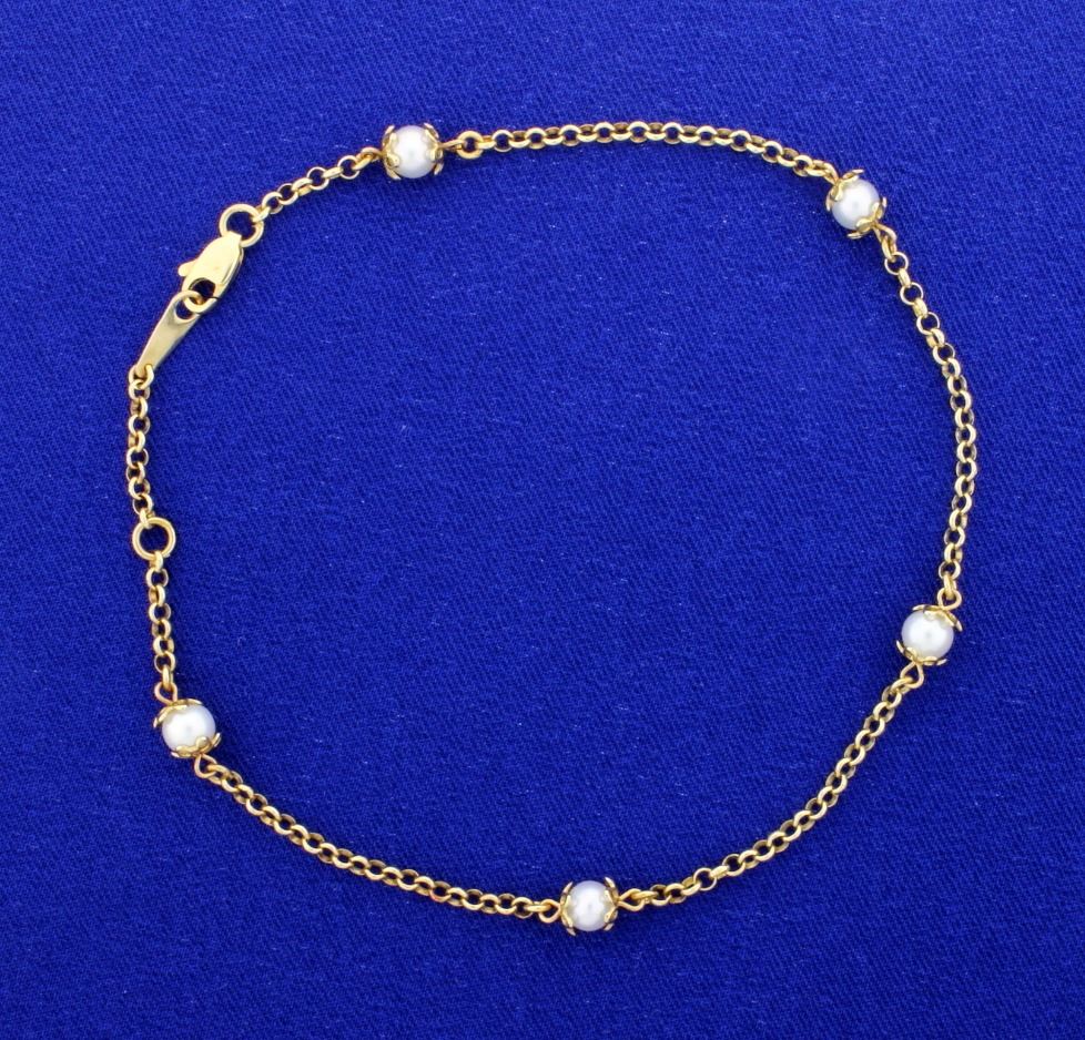 Pearls are approx. 5mm each. The 14k catch is a very safe lobster claw catch. The length is 10" long. 4.5g