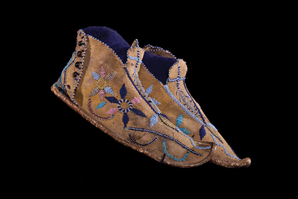Star design with 3 colors of blue beads, yellow and black lines. Yellow ochre remnant on leather, thick hard soles. Victorian style button closures, 4” tall, c. 1890s.