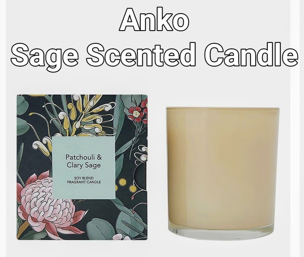 Anko sage-scented soy blend candle, with aromatic patchouli and clary sage notes, new.