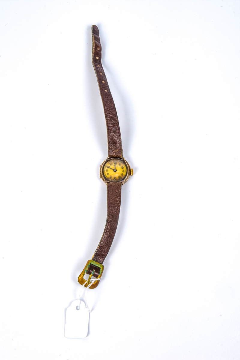 Ankra Women's Watch, 14K Gold Box, dated to the beginning of the 20th century, decorated with Arabic numerals. A brown leather band, probably not original. Mechanical mechanism, working condition. Cleaning is required for the watch panel (darkening on the lower and upper sides), total weight: 9.8 g, diameter: 20 mm.