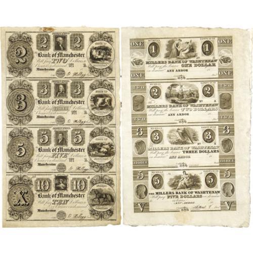<B>Ann Arbor, MI- The Millers Bank of Washtenaw</B></I> $1-$2-$3-$5 18__ G2-G4-G6-G8 Uncut Sheet<BR><B>Manchester, MI- The Bank of Manchester</B></I> $2-$3-$5-$10 18__ G2-G4-G6-G8 Uncut Sheet<BR> The Ann Arbor remainder sheet grades <B>CU. </B></I>The Manchester remainder sheet has been signed by the president. There is a little bit of ink erosion and an approximate half inch edge split. It grades <B>VF</B></I>.<BR><BR><b>Shipping:</b> Coins & Currency (<a target="_blank" href="http://www.heritageauctions.com/common/shipping.php">view shipping information</a>)