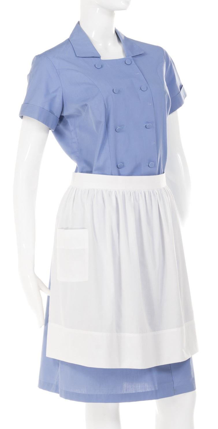107. Ann B. Davis "Alice Nelson" signature maid's uniform from The Brady Bunch.(Paramount TV, 1969-1974) Vintage original signature blue double-breasted uniform with short collar and cuffed sleeves, and 2-scooped hip slash pockets and self button front closure. Retaining the internal Shane bias label. Also includes white cotton drawstring apron with 1-hip pouch pocket and stiff waistband. In vintage fine condition.Comes with an COA from Eastern Costume. $2,000 - $3,000
