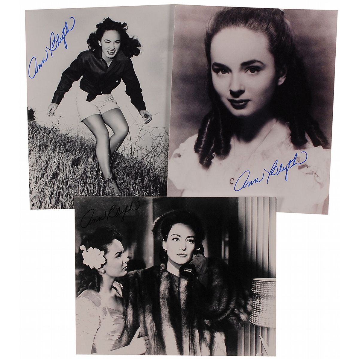 Two different satin-finish photos of Blyth from early in her career, including one with Joan Crawford, two 8 x 10 and one 10 x 8, each signed in blue felt tip by Blyth. In fine condition.