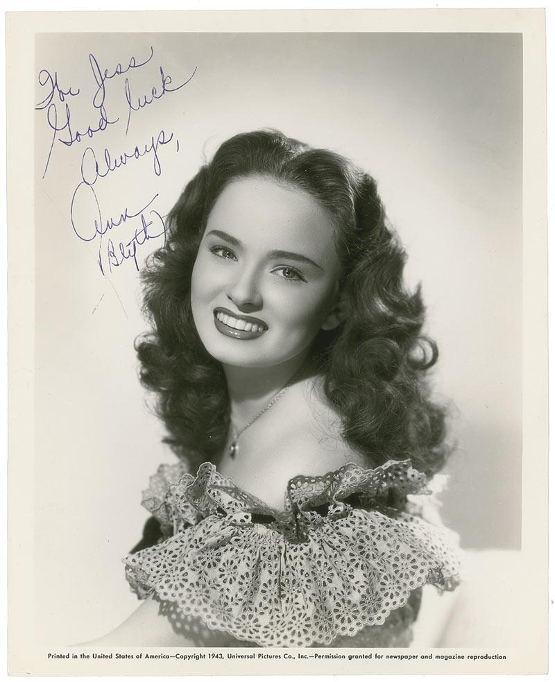 Vintage glossy 8 x 10 publicity photo of Blyth smiling warmly for the camera, signed and inscribed in purple fountain pen “For Jess, Good luck always, Ann Blyth.” In fine condition, with slight rippling to the left edge and faint emulsion crazing.