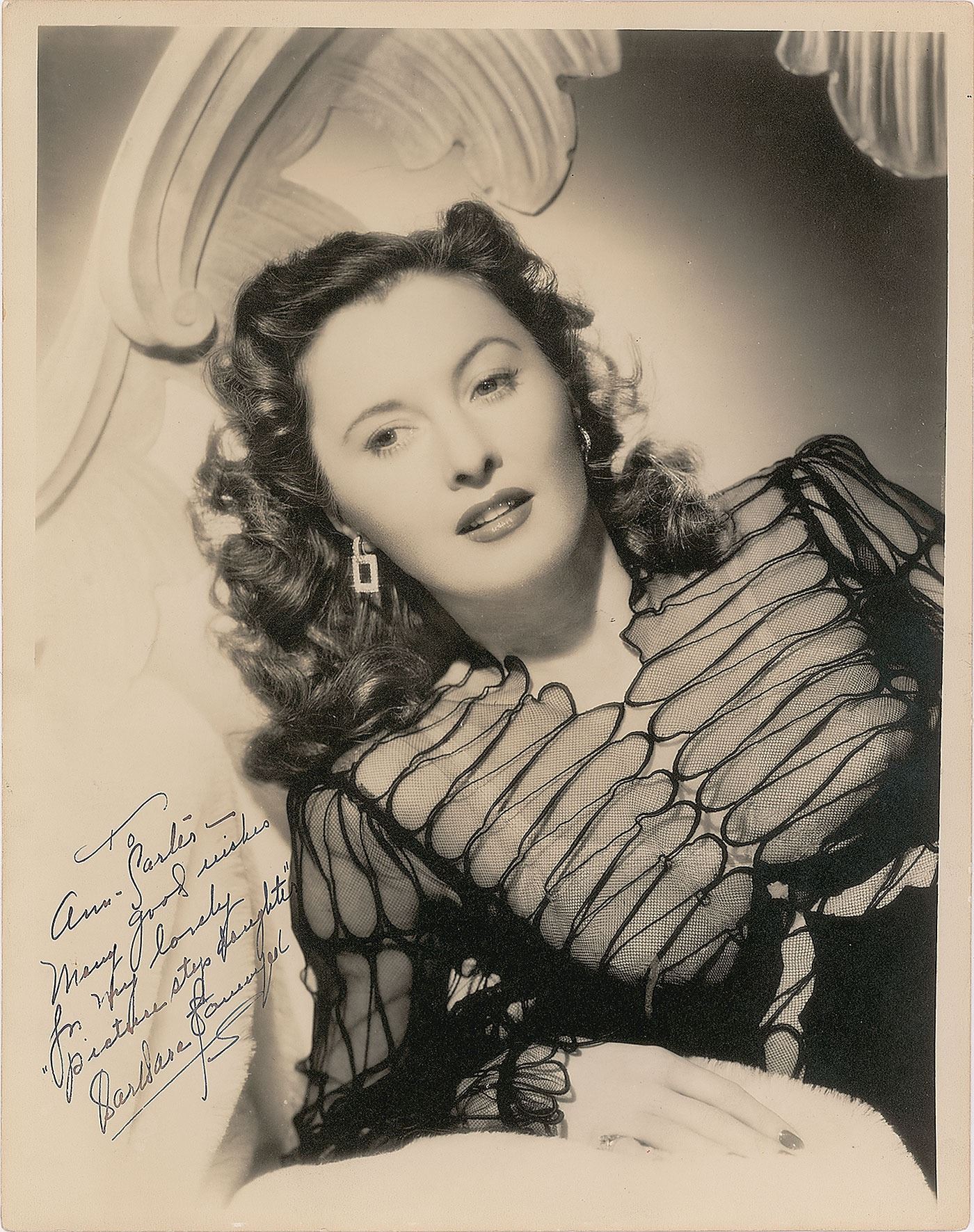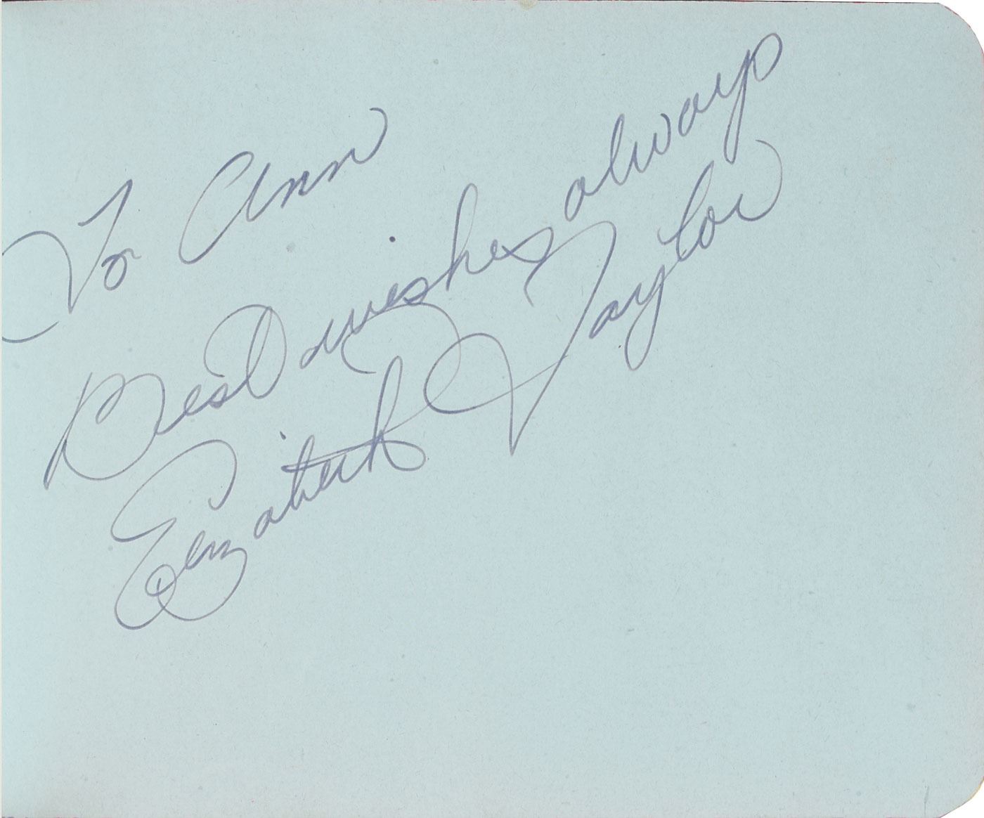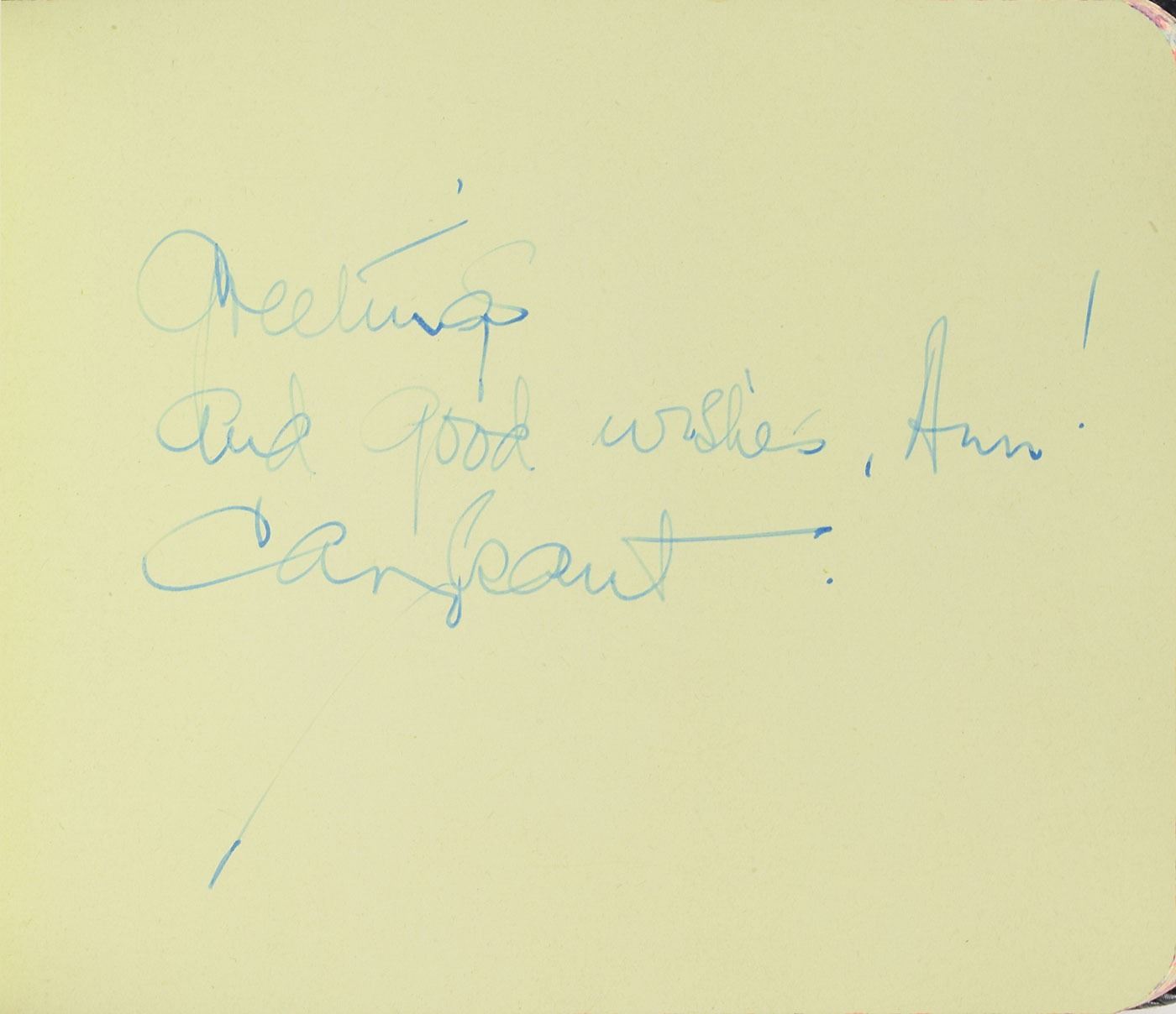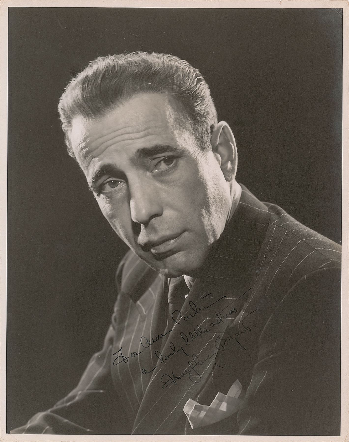 Impressive archive of material relating to the career of Ann Carter, a child actress best known for her roles in films like The Curse of the Cat People and The Two Mrs. Carrolls. The collection follows Carter’s career on radio, stage, and screen, and is highlighted by the host of autographs she obtained from several of her famous costars, including: a handsome matte-finish 11 x 14 studio portrait of Humphrey Bogart against a dark background, signed and inscribed in fountain pen, “For Ann Carter, a lovely little actress, Humphrey Bogart,” with the reverse bearing a Longworth–Warner Bros. photography stamp; and a pair of beautiful matte-finish 11 x 14 studio portraits of Barbara Stanwyck, both signed and inscribed in fountain pen, with one reading, “To Ann Carter—Many good wishes for my lovely ‘picture step daughter,’ Barbara Stanwyck” and “To Ann Carter, One of the loveliest ‘picture’ daughters I ever had, Fondly, Barbara Stanwyck,” with the latter bearing a John Engstead blindstamp. Also included is a pair of leather-bound autograph books, which Carter had signed by several of her fellow cast members from films like The Two Mrs. Carrolls, The Fabulous Dorseys, and The Virginian; signers of the dark blue autograph book include: Gregory Peck, Elizabeth Taylor, Cary Grant (2), Cedric Hardwicke, Dana Andrews, Ida Lupino, and Ray Milland; autographs in the red leather-bound autograph book include: Nigel Bruce (adding a self-portrait sketch), Barbara Stanwyck, Stan Laurel and Oliver Hardy, and Robert Wise, who directed Carter in The Curse of the Cat People.