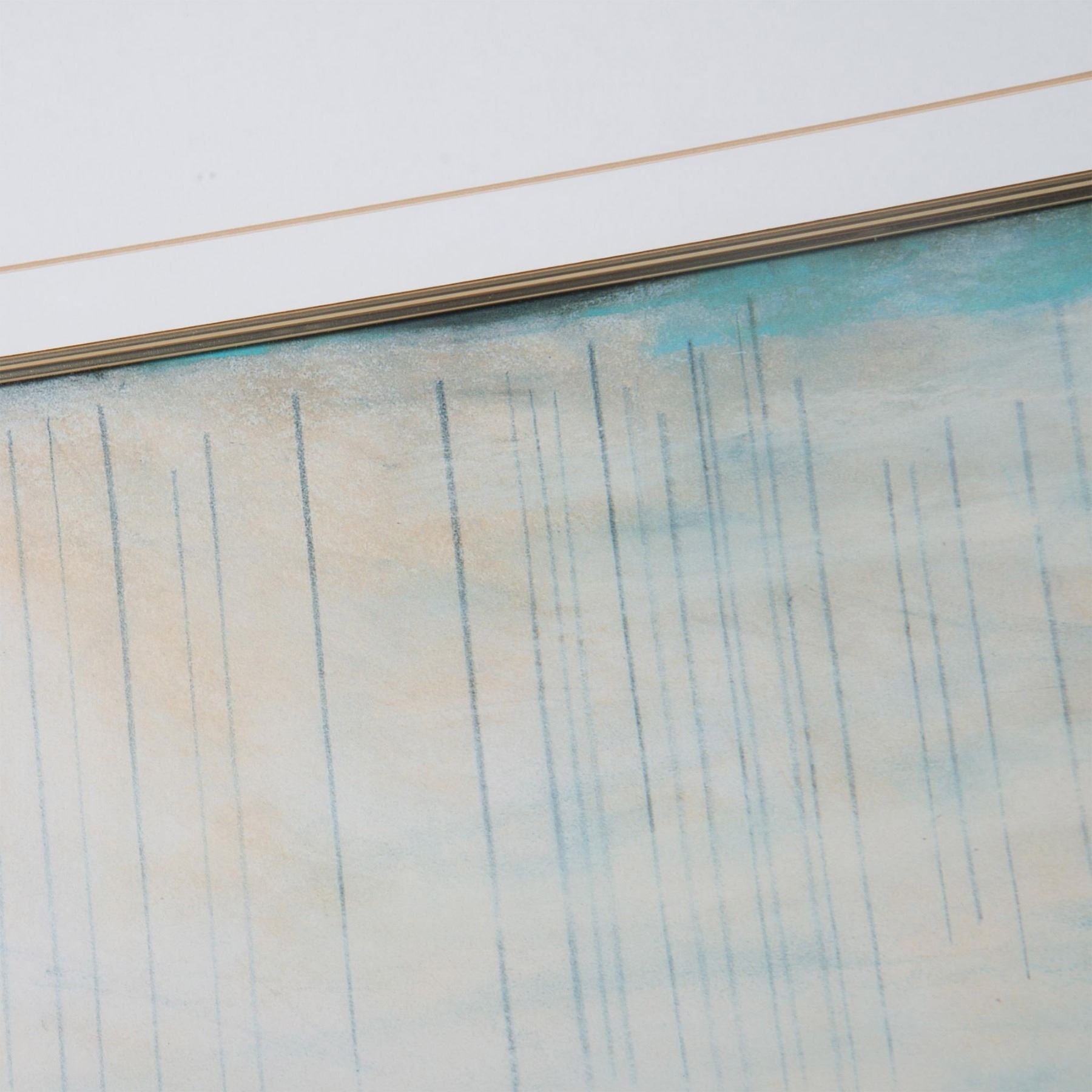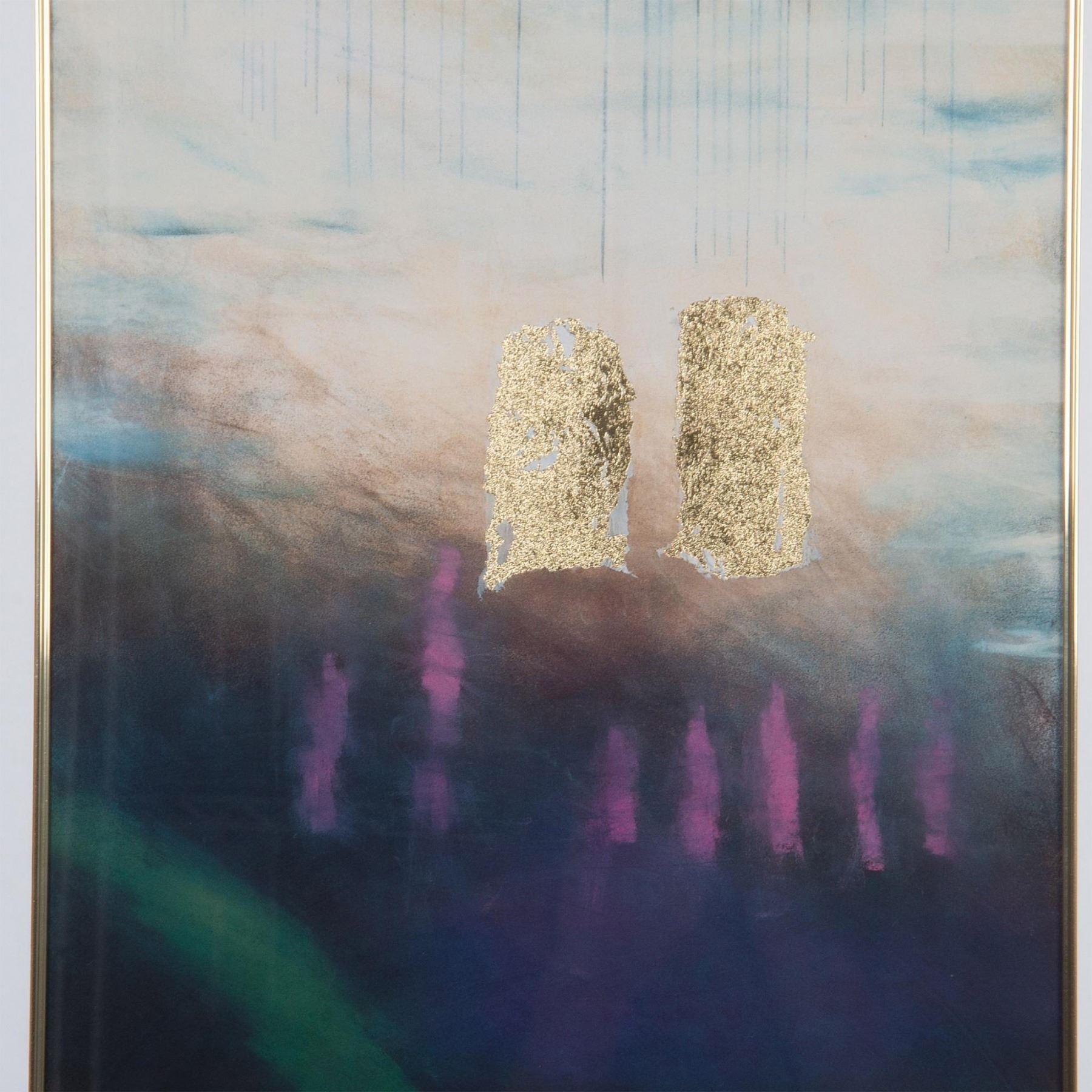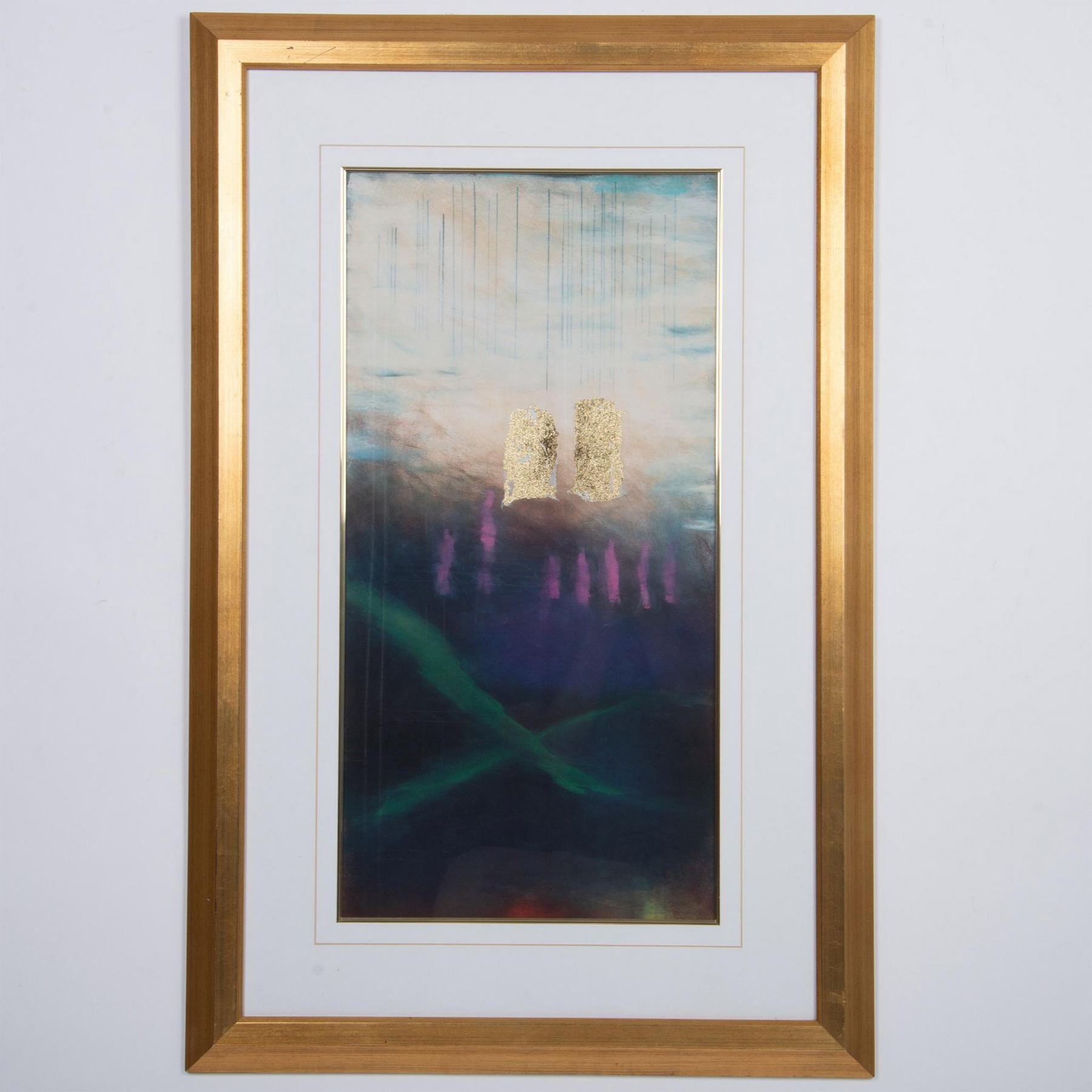 Chimayo Memories I is an offset color serigraph on paper enhanced with gold foil applique after American Contemporary artist Ann Echols' original abstract artwork. Housed in a gilded wood frame with a white mat. Sight size: 14"L x 28"H. Frame dimensions: 26"L x 40"H x 1.50"W. Artwork can be unframed and rolled for shipment.
