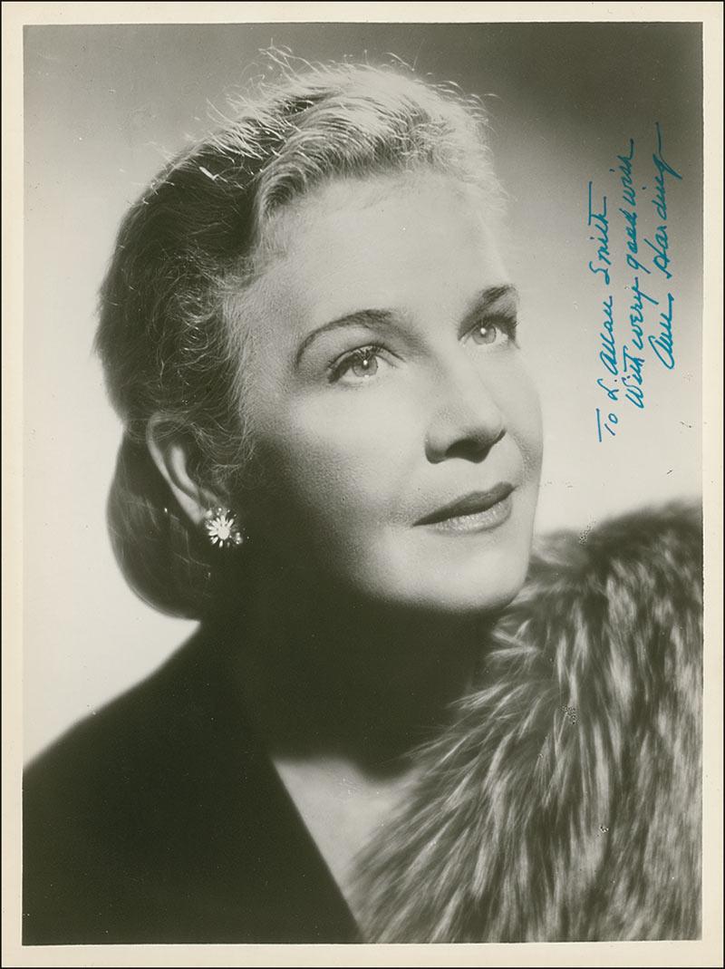 Vintage matte-finish 8 x 10 photo of Harding casting a skyward gaze, signed and inscribed in fountain pen “To L. Allan Smith, with every good wish, Ann Harding.” In fine condition.