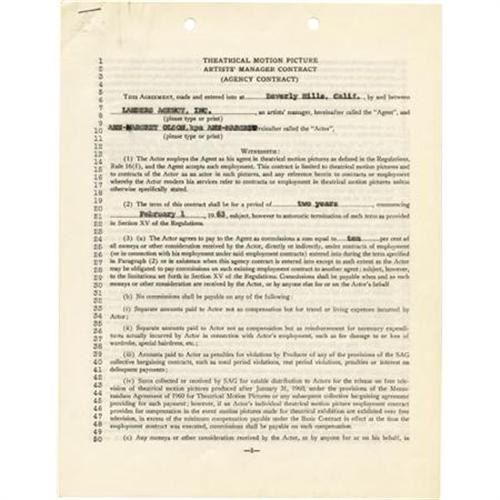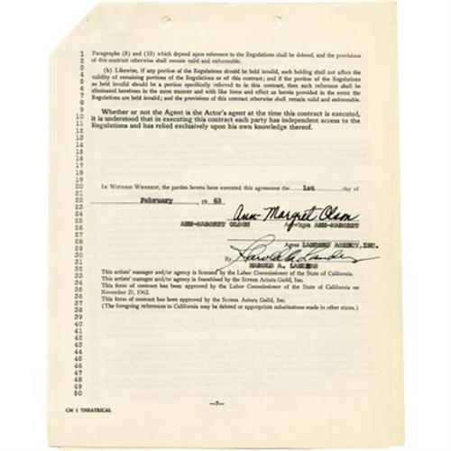 <B>Ann-Margret Signed Contract.</B></I> A two-year agency contract dated February 1, 1963, signed "Ann-Margret Olson" by the actress as well as by agent Harold Landers on the last page in black ink.<BR><BR><b>Shipping:</b> Flat Material, Small (<a target="_blank" href="http://www.heritageauctions.com/common/shipping.php">view shipping information</a>)