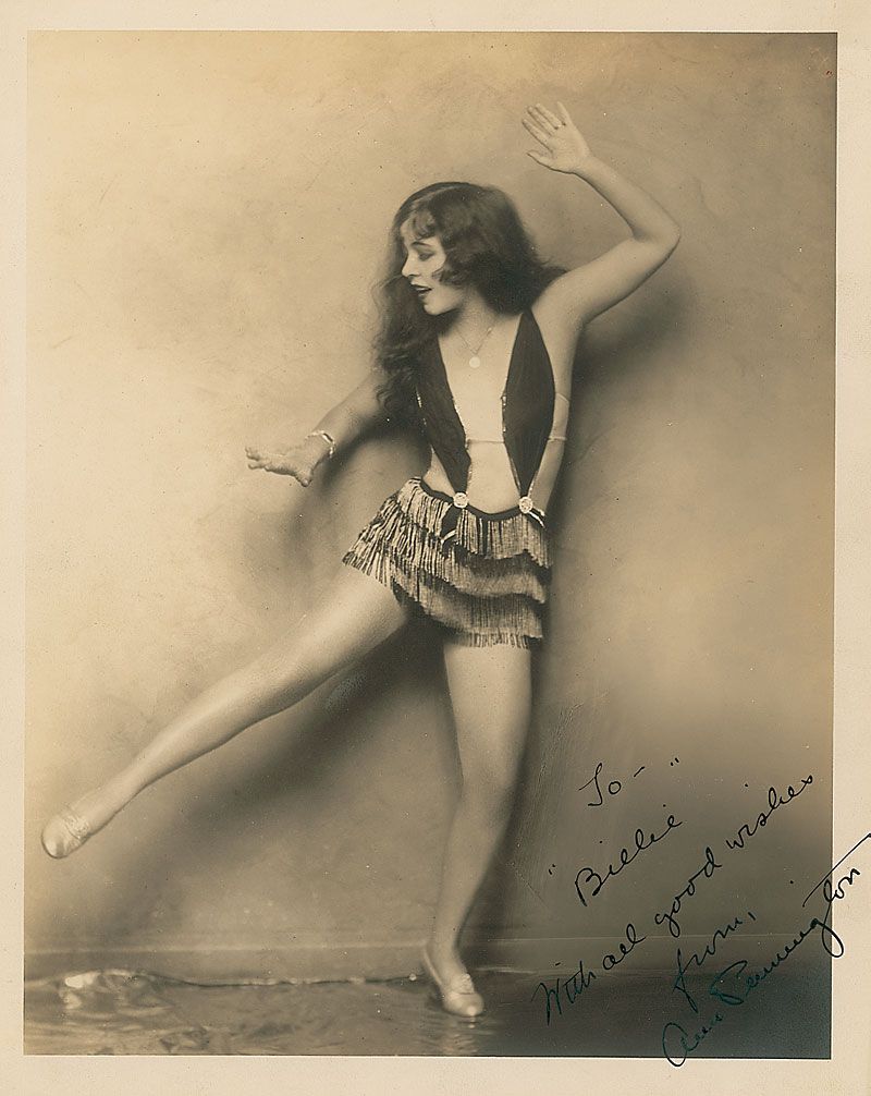Vintage matte-finish 8 x 10 photo of Pennington dancing in a revealing outfit, signed and inscribed in black ink, “To—‘Billie,’ with all good wishes from, Ann Pennington.” In fine condition, with moderate contrast to signature against the dark background.