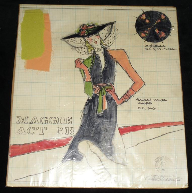 Ann Reinking Costume Sketch - Original hand drawn costume design sketch for Maggie by designer Carrie Robbins. With guild stamp. 12" x 14"