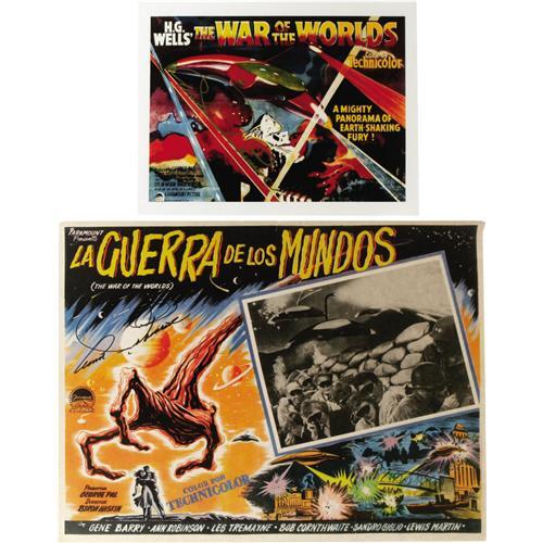 <B>Ann Robinson Signed "War of the Worlds" Photo and Lobby Card.</B></I> An 8.5" x 11" color glossy reproduction of the poster for the 1953 sci-fi classic signed by female lead Ann Robinson in gold marker (in Excellent condition); plus a 16.5" x 13" lobby card for the Mexican release of the movie signed by her in black ink (Very Fine with mild wear and tanning).<BR><BR><b>Shipping:</b> Flat Material, Small (<a target="_blank" href="http://www.heritageauctions.com/common/shipping.php">view shipping information</a>)