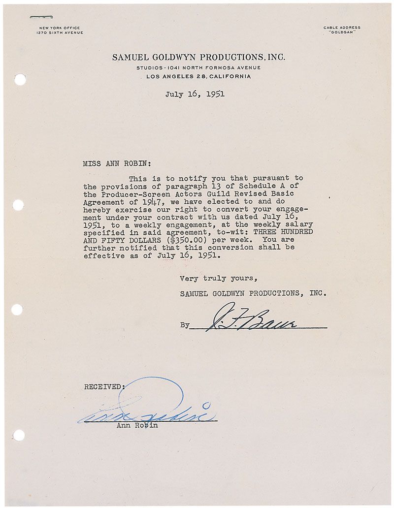Actress best known for her leading role in War of the Worlds. DS, signed “Ann Robin,” one page, 8.5 x 11, July 16, 1951. Samel Goldwyn Productions informs Robinson that they “exercise our right to convert your engagement under your contract…to a weekly engagement, at the weekly salary…Three Hundred and Fifty Dollars…per week.” Signed at the conclusion “Ann Robin.” In fine condition, with punch holes to left edge, a staple to top left corner and a few creases.