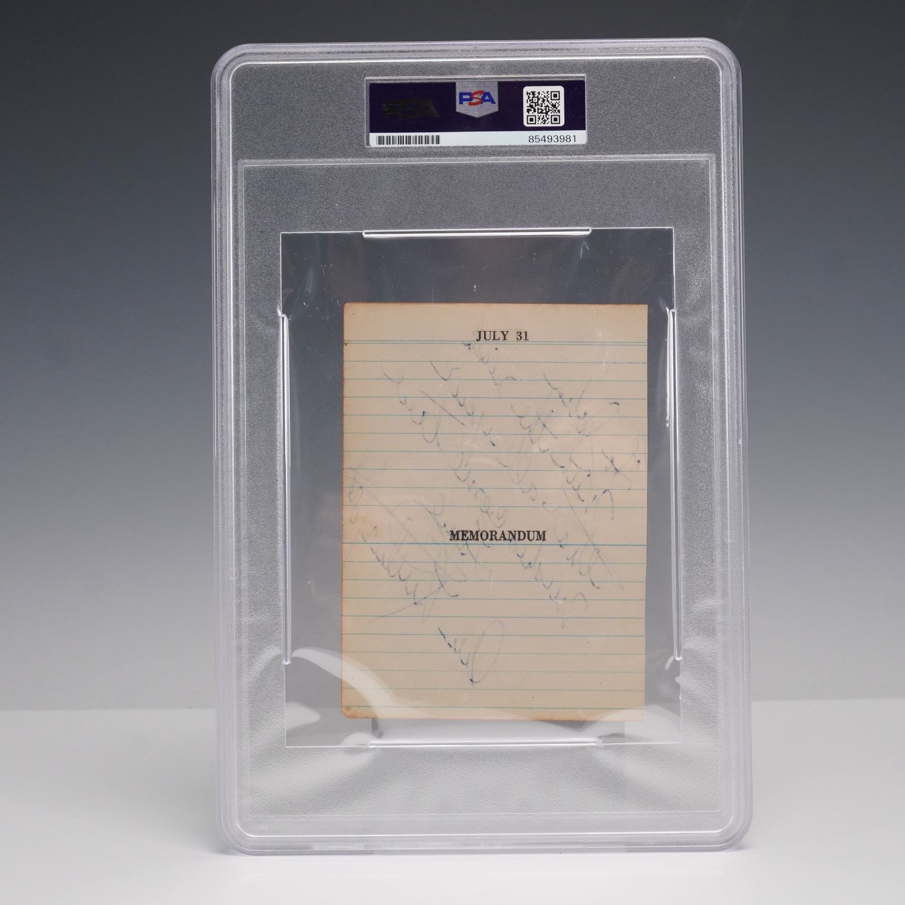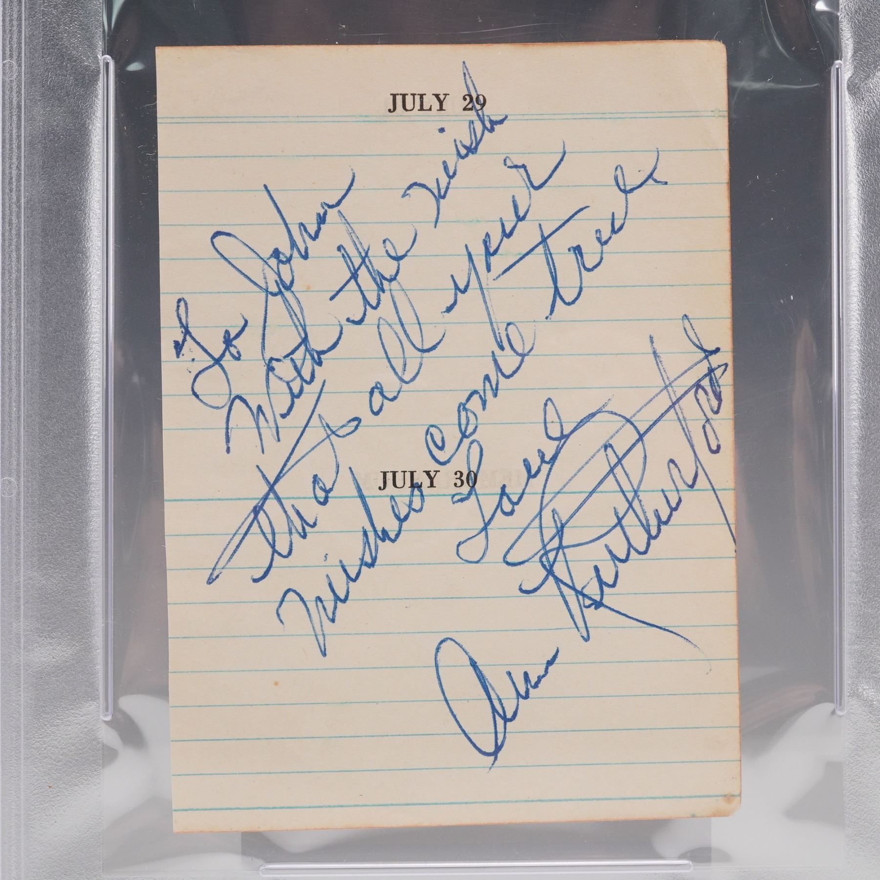 Cut autograph of actress Ann Rutherford, signed in blue ink on a lined page. The inscription reads, To John, With the wish that all your wishes come true, Love, Ann Rutherford. Authenticated and encapsulated by PSA/DNA with certification number 85493981. Measures in case 6.5"L x 10"H.