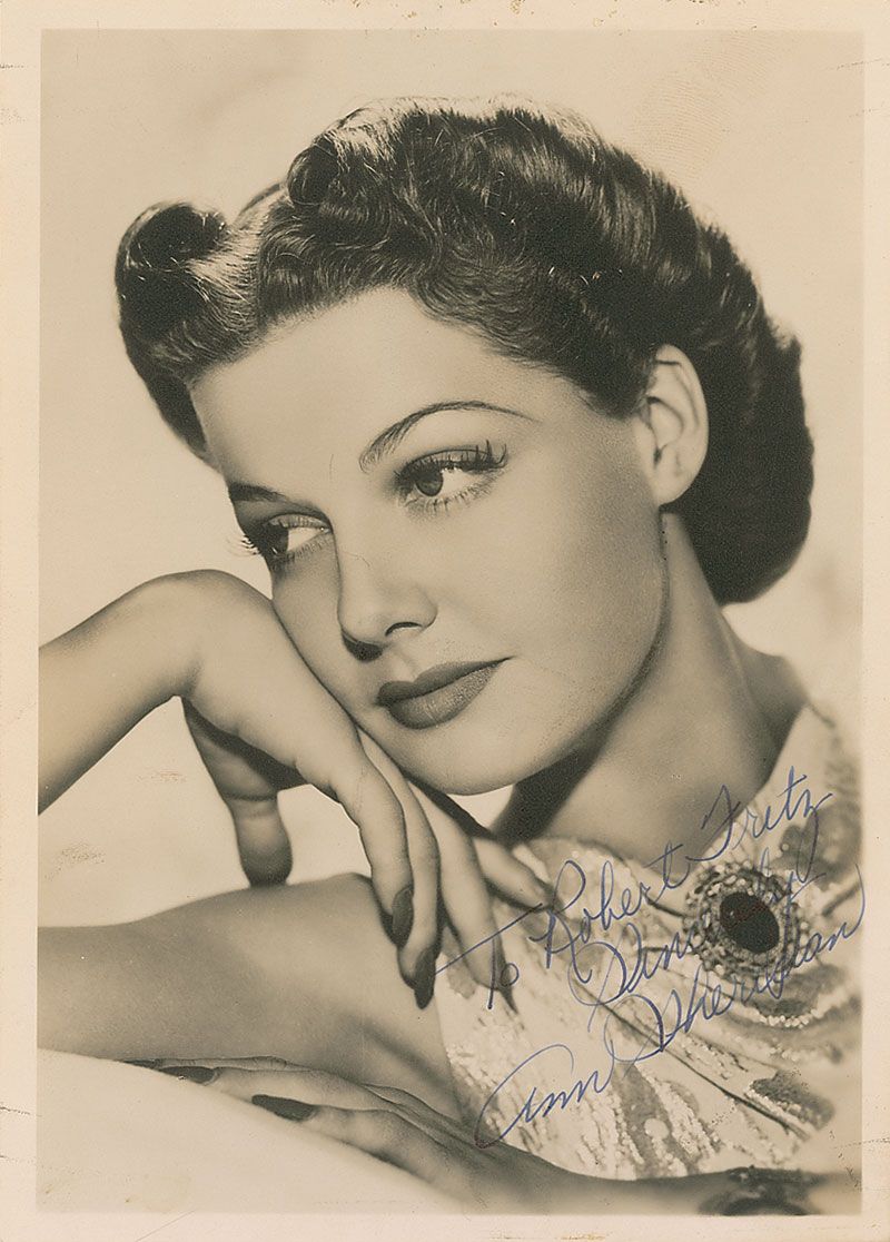 Lovely vintage matte-finish 5 x 7 photo of Sheridan resting on her hand, signed and inscribed in fountain pen, “To Robert Fritz, Sincerely, Ann Sheridan.” In fine condition, with slight soiling and impressions to the borders.