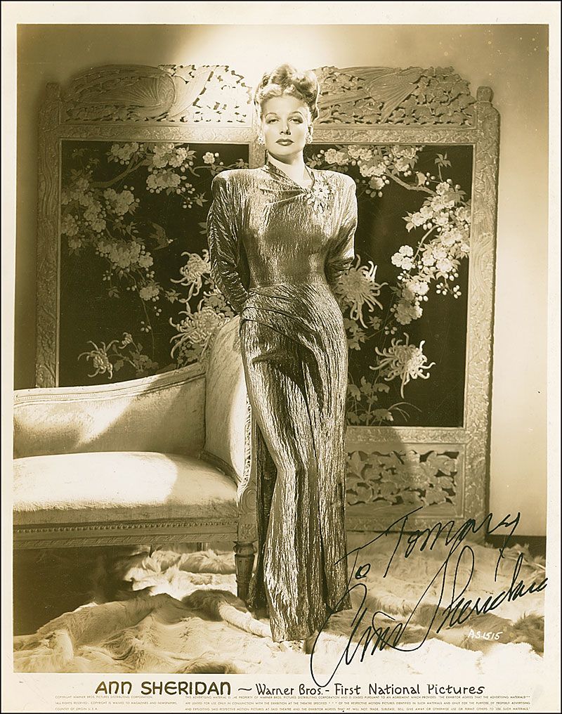 Vintage glossy 7.75 x 10 Warner Bros. publicity photo, signed and inscribed in fountain pen, “To Tommy, Ann Sheridan.” The photo is affixed to a same-sized backing. There is evidence of a failed first attempt of a signature and inscription. In very good condition, with scattered creasing, scratching, and crazing, a small area of soiling at the top right corner, silvering to the darker areas, and trimmed edges.