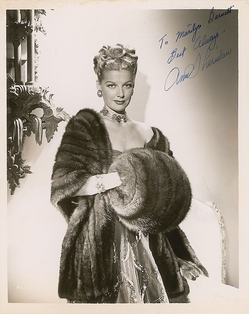 Vintage pearl-finish 8 x 10 double weight Hurrell photo of Sheridan in a fur wrap with matching muff, with photographer’s stamp on reverse, signed and inscribed in fountain pen “To Marilyn Burnett, Best always—Ann Sheridan.” In fine condition, with some light soiling along top edge.