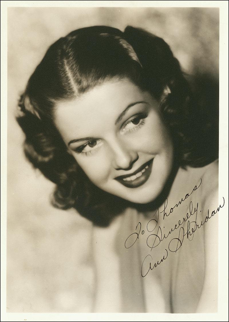 Lovely, vintage sepia matte-finish 5 x 7 portrait, signed and inscribed in black fountain pen “To Thomas, Sincerely, Ann Sheridan.” In very fine condition. Pre-certified PSA/DNA and RRAuction COA.