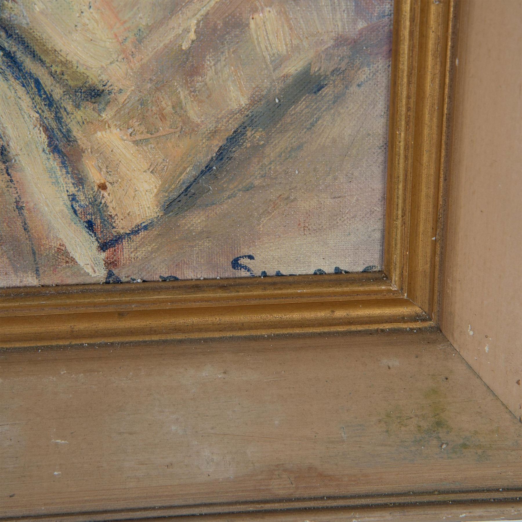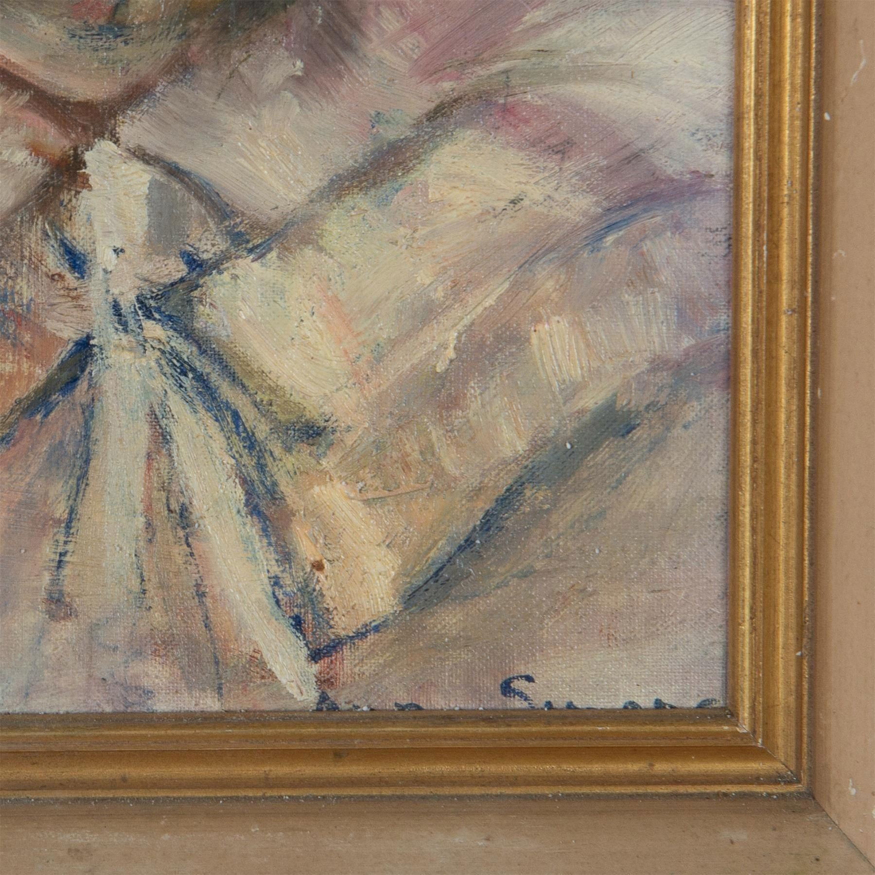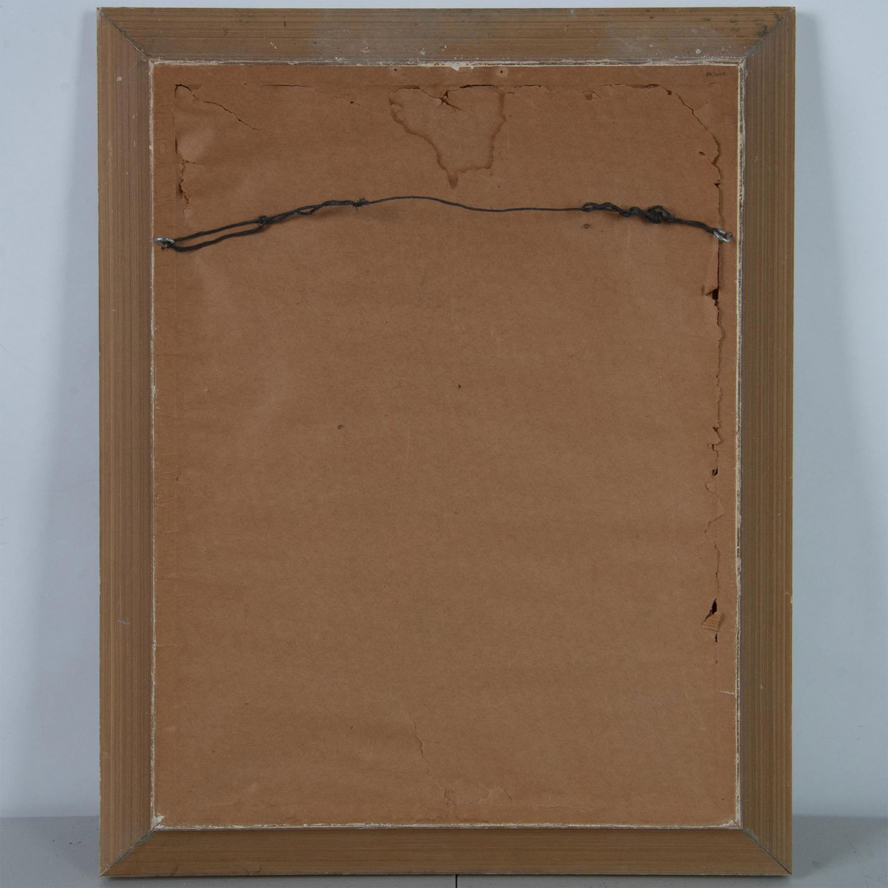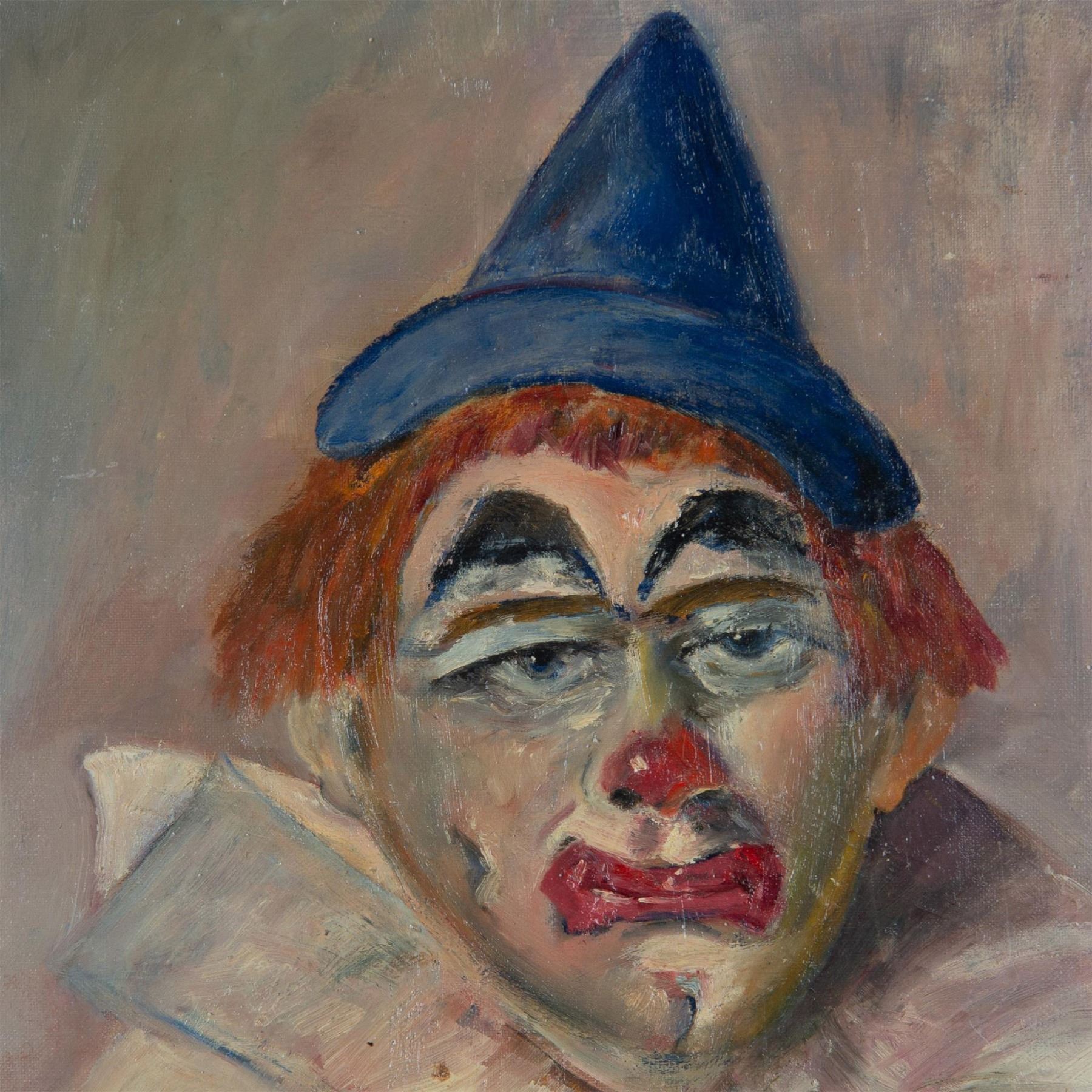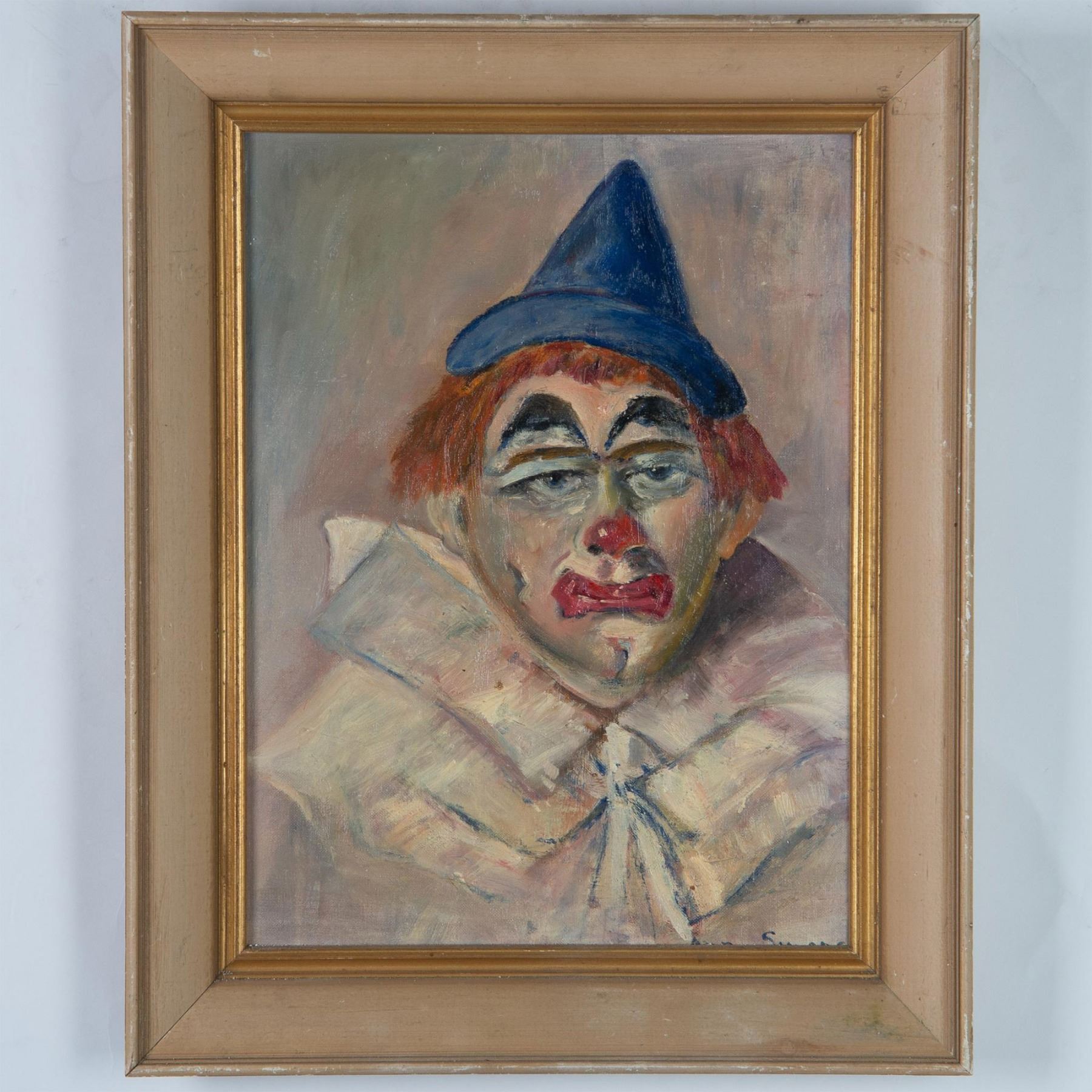 Original oil on board of a portrait of a clown that the artist depicts in a seemingly moment of introspection. Housed in a brown wood frame with an ecru linen border. Signature on lower right: Ann Simons? Artwork dimensions: 11.50"L x 15.50"H. Frame size: 16"L x 20"H x 2"W.