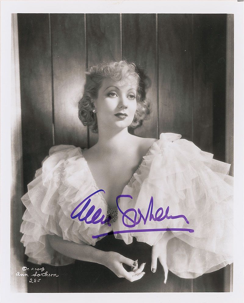 Attractive glossy 8 x 10 photo of Sothern in large ruffles, signed in purple felt tip. In fine condition.