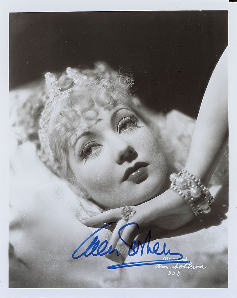 Glossy 8 x 10 close-up photo of Sothern resting her head on a pillow, signed in blue felt tip. In very fine condition.